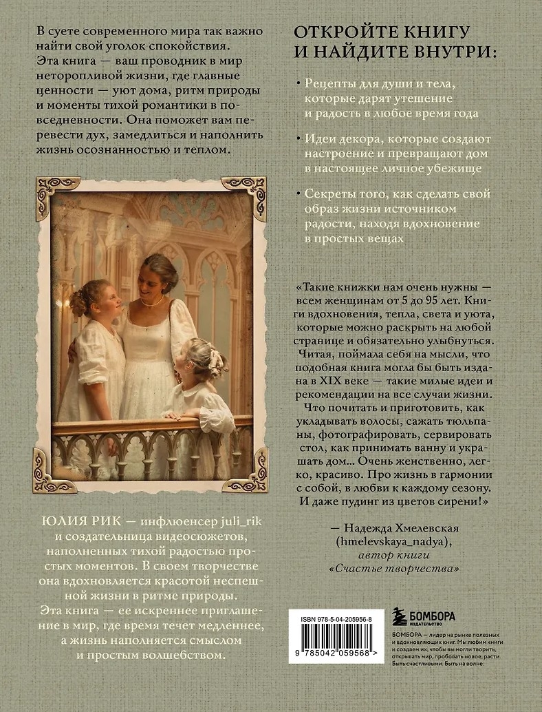 Mani sauc Džūlija Rika, un es jūs aicinu uz brīnišķīgo lēnas dzīves, iedvesmas un radošuma prieka pasauli. Šī grāmata ir radusies no manas dziļās pārliecības, ka patiesa laime slēpjas nevis panākumu meklējumos, bet gan spējā palēnināt tempu, ieelpot un atrast skaistumu vienkāršos brīžos: lietus skaņās ārā, svaigi ceptas maizes aromātā, mājas siltumā.
