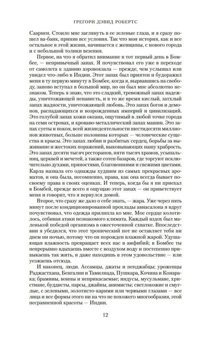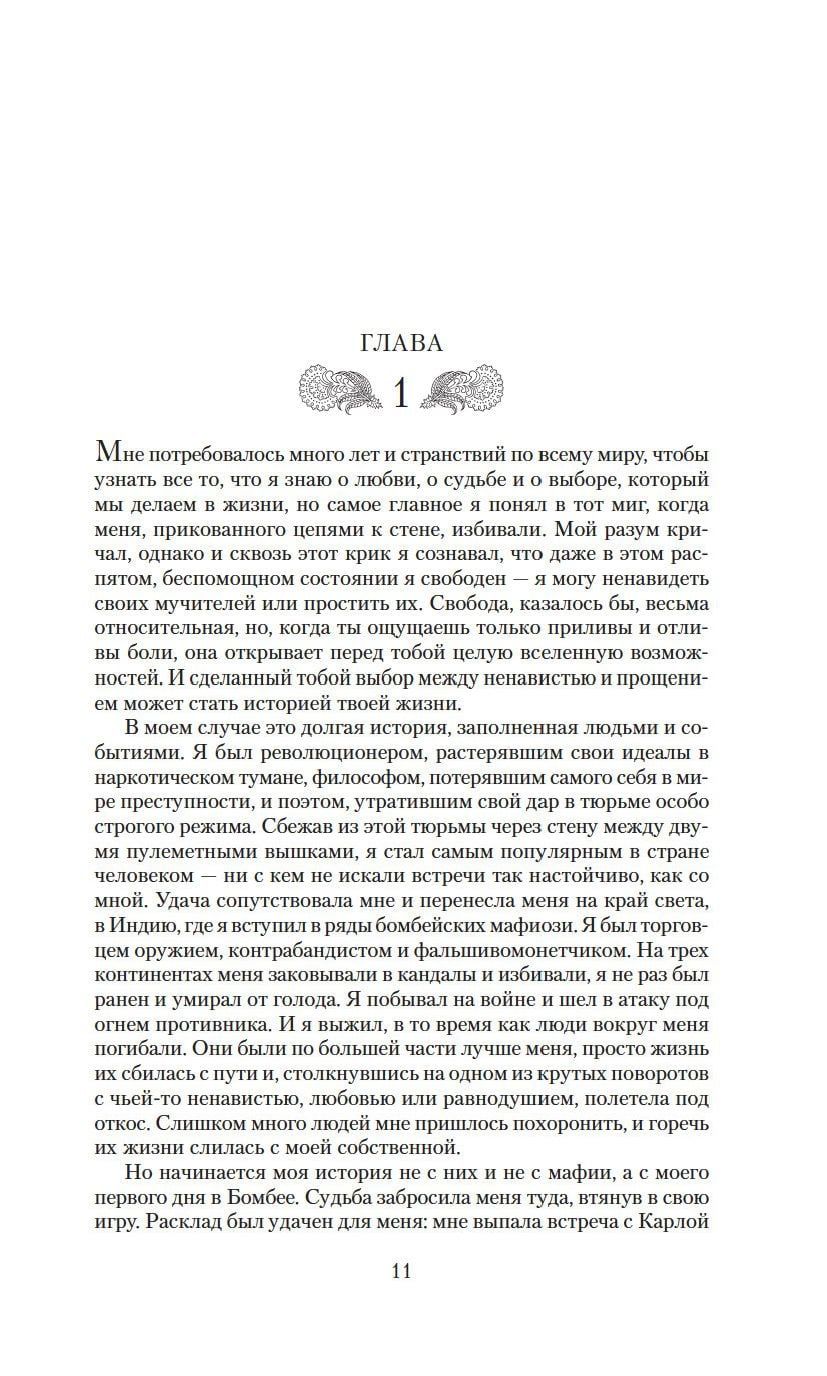 Piedāvājam lasītājam vienu no spilgtākajiem 21. gadsimta sākuma romāniem (kas 2015. gadā saņēma ilgi gaidīto turpinājumu “Kalna ēna”). Šī cilvēka, kuram izdevās izkļūt no bezdibeņa un izdzīvot, mākslinieciskā atzīšanās tika pārdota visā pasaulē četru miljonu eksemplāru tirāžā (no kuriem pusmiljons bija Krievijā) un izpelnījās entuziasma pilnus salīdzinājumus ar Jaunā laika labāko rakstnieku darbiem no Melvilas līdz Hemingvejam. Tāpat kā autors, arī šī romāna varonis ilgus gadus slēpās no likuma. Pēc šķiršanās no sievas viņam atņemtas vecāku tiesības, viņš kļuva atkarīgs no narkotikām, veica vairākas laupīšanas un Austrālijas tiesa viņam piesprieda deviņpadsmit gadu cietumsodu. Otrajā kursā izbēdzis no stingrās drošības cietuma, viņš devās uz Bombeju, kur viltoja un kontrabandas ceļā ieveda naudu, pārdeva ieročus un cīnījās Indijas mafijas kāršu cīņās, un atrada savu īsto mīlestību, tikai pazaudējot viņu, lai atkal atrastu.