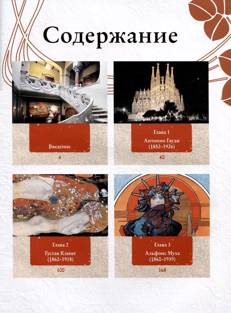 Jūgendstils, jūgendstils, jūgendstils, secesija - tas viss ir par viņu, skaistu, oriģinālu, noslēpumainu un dažreiz atklāti juteklisku stilu, kas 19. un 20. gadsimta mijā pakļāva tēlotājmākslu. Ar šo mākslas fenomenu saistīti daudzi slaveni arhitekti, gleznotāji, grafiķi un lietišķās mākslas meistari, taču, iespējams, spilgtākie un nozīmīgākie ir Antonio Gaudi, Gustava Klimta un Alfonsa Mučas vārdi, par ko liecina nemitīgā uzmanība viņu personībām. no visplašākās auditorijas. Šiem trim autoriem ir veltīta šī grāmata, kas tomēr neaprobežojas tikai ar viņu radošo mantojumu minētā stila ietvaros, bet ļauj izsekot katra meistara pakāpeniskajai attīstībai no vissenākajiem darbiem līdz nobriedušiem darbiem, demonstrējot to interesi apgūt arvien jaunas robežas strauji mainīgajā pasaulē.