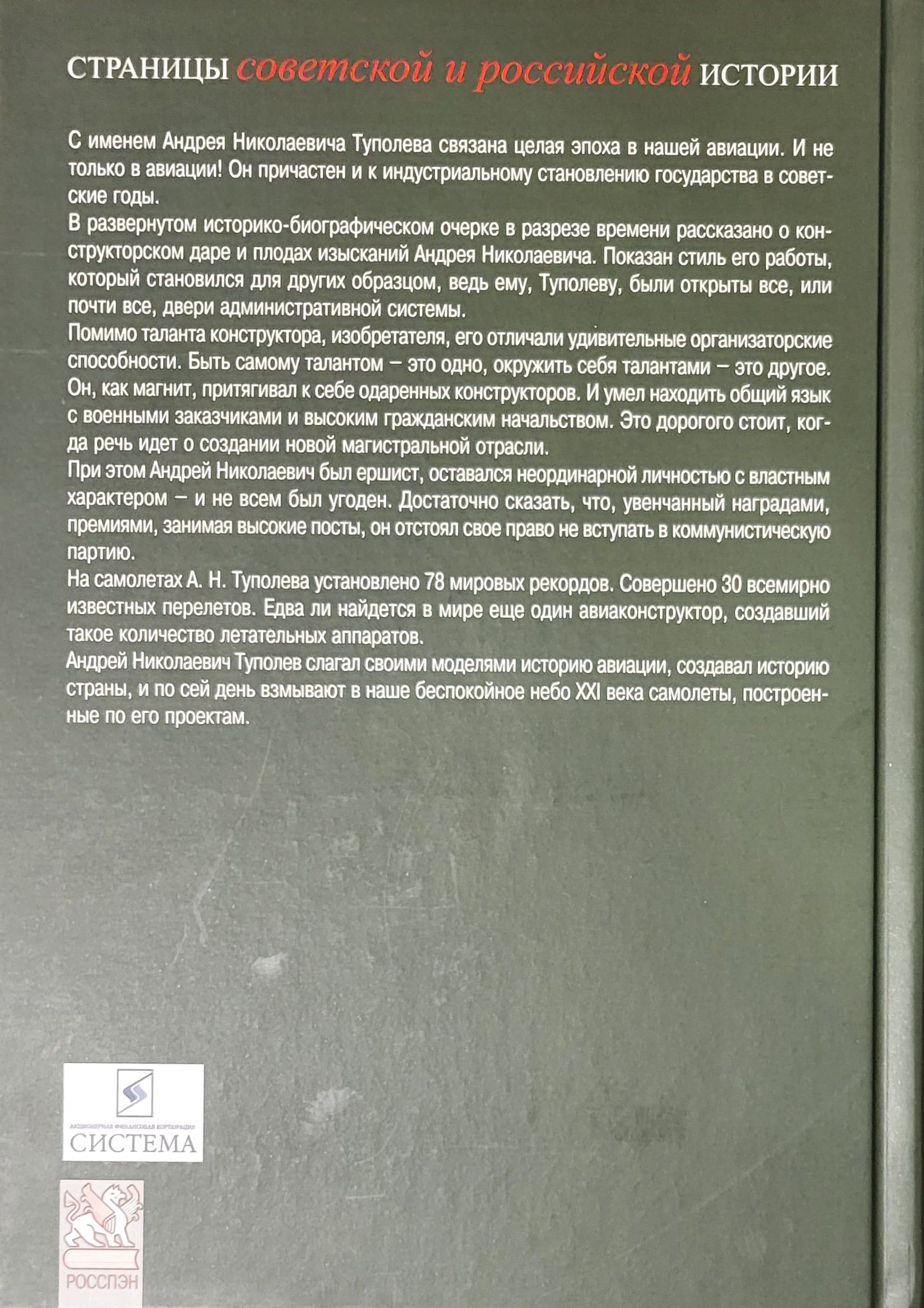 Andreja Nikolajeviča Tupoļeva vārds ir saistīts ar veselu laikmetu mūsu aviācijā. Un ne tikai aviācijā! Viņš arī padomju gados bija iesaistīts valsts industriālajā attīstībā. Šī detalizētā vēsturiskā un biogrāfiskā eseja laika posmā stāsta par dizaina talantu un Andreja Nikolajeviča pētījumu augļiem. Tas parāda viņa darba stilu, kas kļuva par paraugu citiem, jo viņam, Tupoļevam, bija atvērtas visas vai gandrīz visas administratīvās sistēmas durvis. Papildus dizainera un izgudrotāja talantam viņš izcēlās ar pārsteidzošām organizatoriskām spējām. Būt pašam talantīgam ir viena lieta, cita lieta ir apņemt sevi ar talantu. Viņš kā magnēts piesaistīja talantīgus dizainerus. Un viņš prata atrast kopīgu valodu ar militārajiem klientiem un augstām civilajām amatpersonām. Tas ir daudz vērts, ja runa ir par jaunas galvenās nozares izveidi. Tajā pašā laikā Andrejs Nikolajevičs bija stulbs, palika ārkārtējs cilvēks ar valdonīgu raksturu - un nebija patīkams visiem. Pietiek ar to teikt, vainagojoties ar balvām un balvām