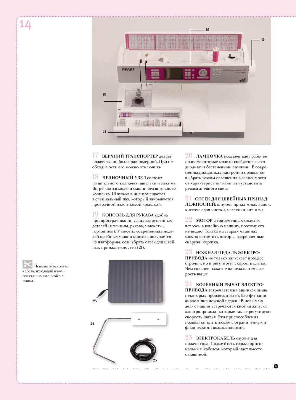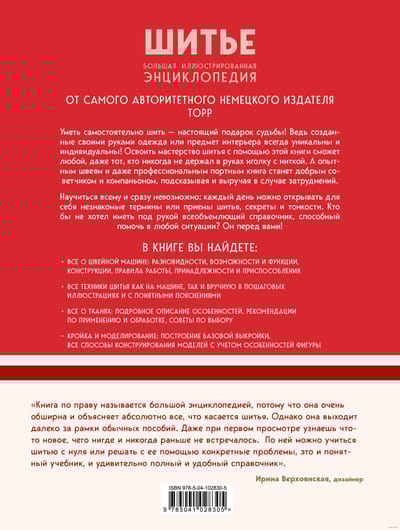 Šis ir pasaulē visplašākais un autoritatīvākais ilustrētais izdevums, kas veltīts šūšanas tehnoloģijai. Enciklopēdijas lappusēs atradīsiet visu nepieciešamo informāciju par šujmašīnu šķirnēm un katras no tām iespējām, par manuālo un mašīnu šuvju un dūrienu tehnoloģiju, kas paredzēta tekstilizstrādājumu slaucīšanai, šūšanai, šūšanai un dekoratīvai apdarei, kā arī par apģērbu konstruēšanas un piegriešanas noteikumiem, pamatojoties uz dažādu figūru tipu pamatšūtnēm, ņemot vērā ķermeņa uzbūves individuālās īpašības, un daudz ko citu. Grāmata būs neaizstājams palīgs tiem, kas tikai sāk apgūt piegriešanas un šūšanas mākslu, pateicoties vairāk nekā 2000 ilustrācijām un skaidriem, soli pa solim aprakstītiem ne tikai pamata šūšanas paņēmieniem, bet, pats galvenais, tiem, kas zināmi tikai profesionāļiem. 2. grāmatas izdevums iznācis jaunā, uzlabotā tulkojumā un papildināts ar nodaļām par patchwork un quilting, kas nebija iekļautas pirmajā izdevumā krievu valodā!