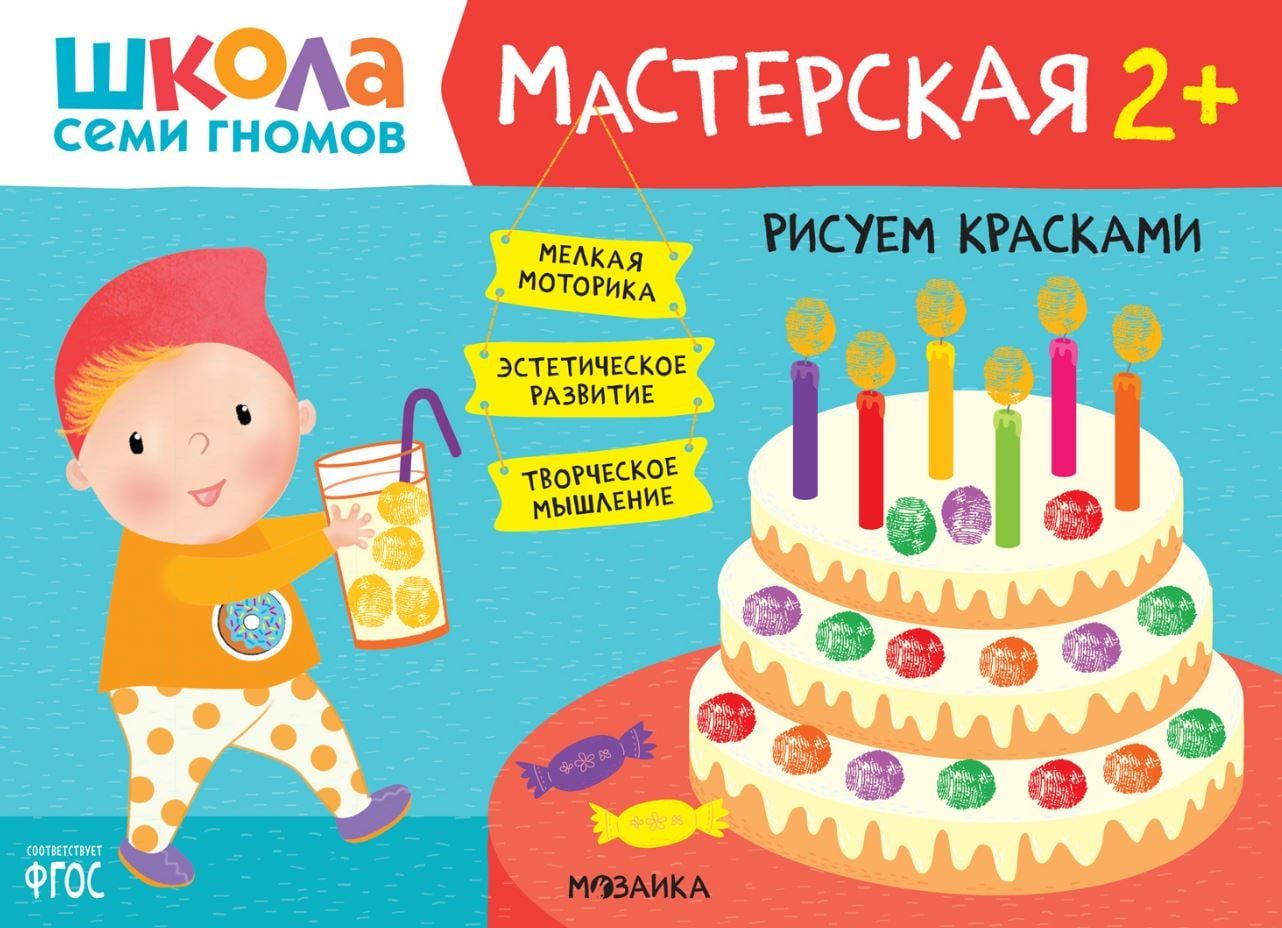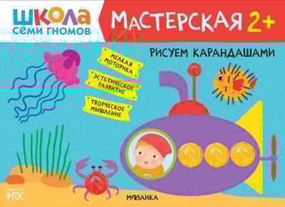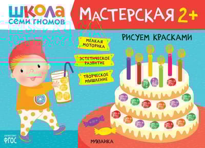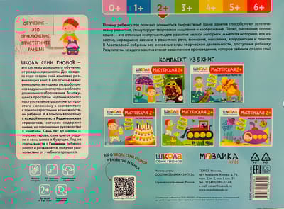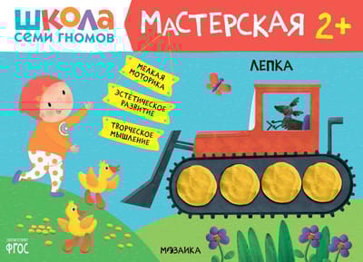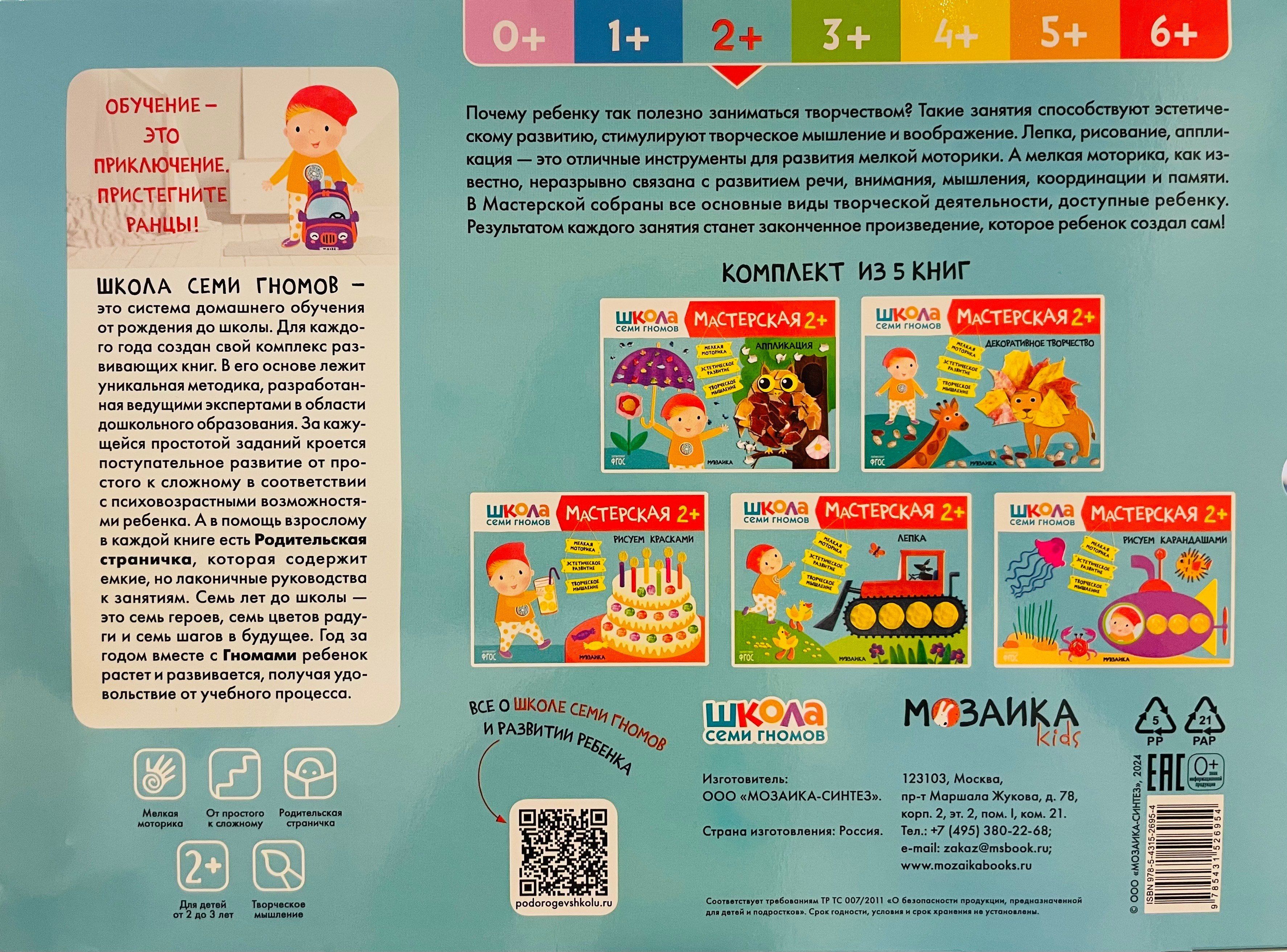 "Septiņu rūķīšu skola. "Darbnīca 2+" ir krāsainu albumu komplekts aizraujošām radošām aktivitātēm ar bērniem vecumā no 2 līdz 3 gadiem. Nodarbības par tēmām, kas bērnam ir tuvas un saprotamas, ir sakārtotas pieaugošas sarežģītības secībā: pakāpeniski pārejot no vienkāršu prasmju apgūšanas uz sarežģītākiem uzdevumiem. Katras nodarbības rezultāts būs pabeigts darbs, ko bērns pats radījis. Albuma beigās mazajam māksliniekam būs liels noslēguma uzdevums, kurā viņš varēs pielietot visas savas jauniegūtās prasmes.