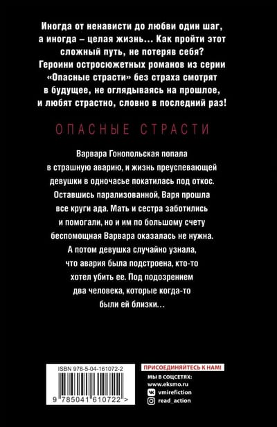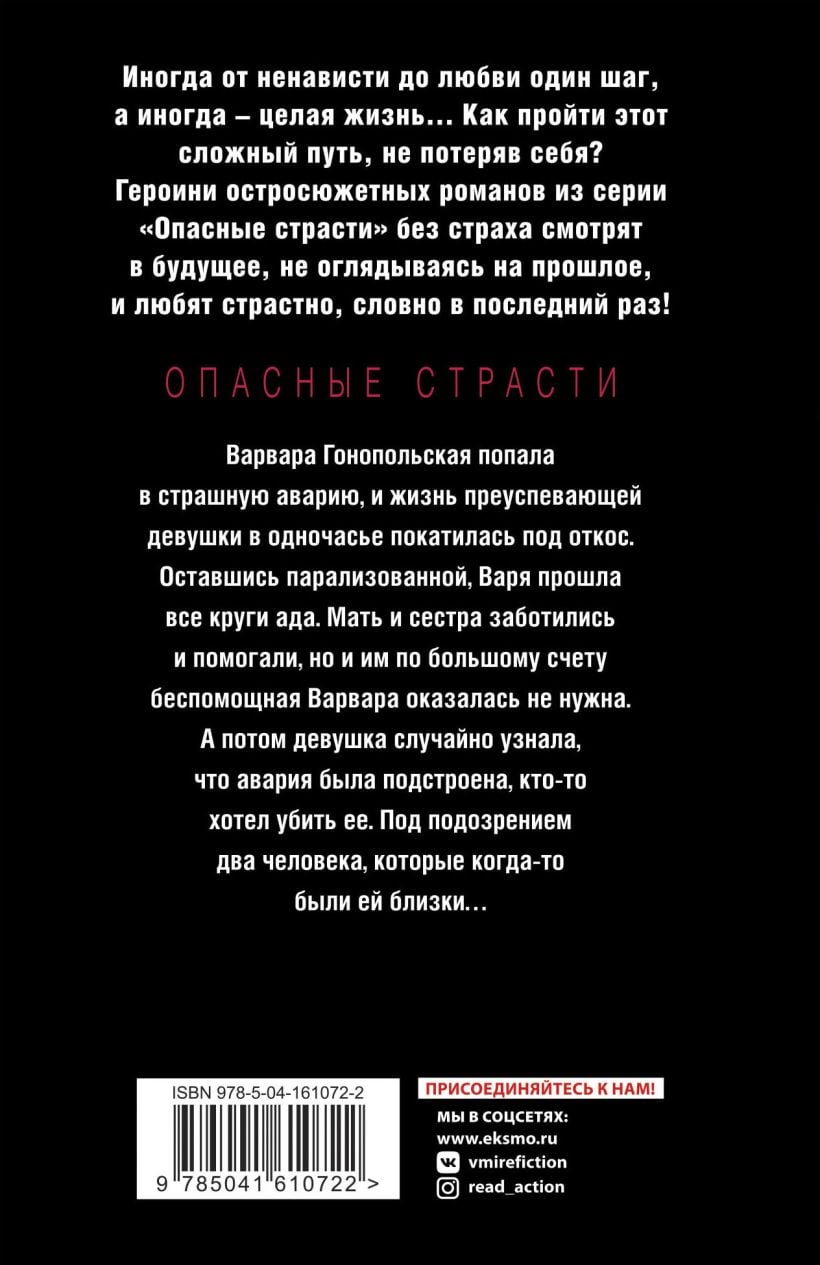 Elena Gordina prezentē jaunu grāmatu, drosmīgu un spilgtu romānu, kurā ir viss: mīlestība, naids, vara, lāsts, daudz sāpju, daudz nodevības. Varvara Gonopolskaja iekļuva šausmīgā negadījumā, un veiksmīgas meitenes dzīve vienā naktī gāja lejup. Paralizēta, Varja izgāja cauri visiem elles lokiem. Māte un māsa par viņu rūpējās un viņai palīdzēja, taču viņiem kopumā nebija vajadzīga bezpalīdzīgā Varvara. Un tad meitene nejauši uzzināja, ka avārija ir inscenēta, kāds gribēja viņu nogalināt. Aizdomās turēti divi cilvēki, kas savulaik bijuši viņai tuvi...