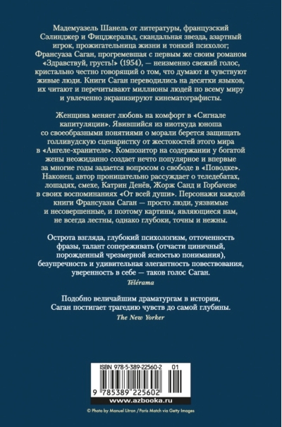 Literatūras mademoiselle Chanel, franču Salindžers un Ficdžeralds, skandaloza zvaigzne, azartspēļu spēlētāja, prolifere un smalka psiholoģe; Fransuāza Sagana, kas izcēlās ar savu pirmo romānu "Sveiks, skumjas!" (1954) - nemainīgi svaiga balss, kas ar kristālisku atklātību runā par to, ko domā un jūt dzīvi cilvēki. (1954), - nemainīgi svaiga balss, kas kristālskaidri atklāti runā par to, ko domā un jūt dzīvi cilvēki. Sagana grāmatas ir tulkotas desmitiem valodu, tās lasa un pārlasa miljoniem cilvēku visā pasaulē un aizrautīgi ekranizē filmu veidotāji. "Padošanās signālā" sieviete maina mīlestību pret komfortu. No nekurienes parādījies jauns vīrietis ar savdabīgiem priekšstatiem par morāli uzņemas aizsargāt Holivudas scenāristu no pasaules nežēlības filmā "Sargeņģelis". Bagātas sievas atbalstīts komponists negaidīti rada kaut ko populāru un pirmo reizi daudzu gadu laikā uzdod jautājumu par brīvību filmā "Pavada". Visbeidzot autors savās atmiņās "No sirds" iedziļinājies runā par televīzijas debatēm, zirgiem, smiekliem, Katrīnu Denēvu, Žoržu Sandu un Gorbačovu. Katras Fransuāza Sagana grāmatas varoņi ir vienkārši cilvēki, neaizsargāti un nepilnīgi, tāpēc arī tēli, kas mums atklājas, ne vienmēr ir glaimojoši, taču tie ir dziļi, precīzi un maigi.
