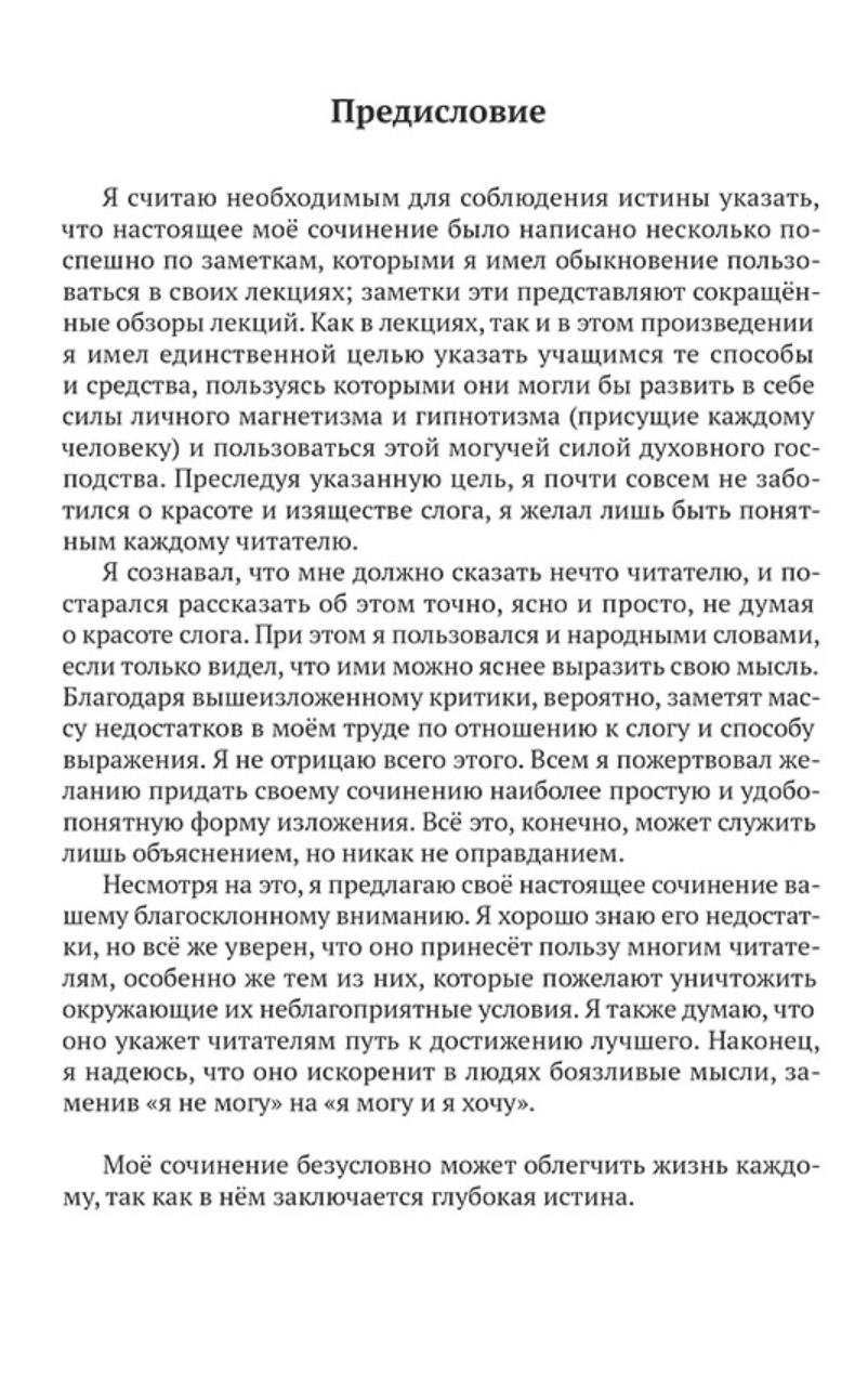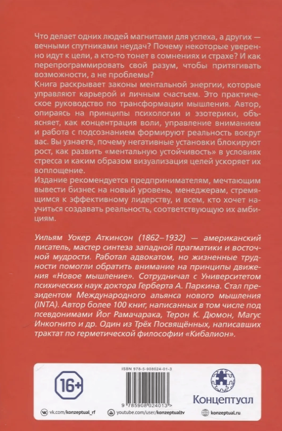 Kas dažus cilvēkus padara par veiksmes magnētu, bet citus par mūžīgiem neveiksmju pavadoņiem? Kāpēc daži pārliecināti tiecas pēc saviem mērķiem, bet citi slīkst šaubās un bailēs? Un kā jūs varat pārprogrammēt savu prātu, lai piesaistītu iespējas, nevis problēmas? Šī grāmata atklāj garīgās enerģijas likumus, kas nosaka jūsu karjeru un personīgo laimi. Šis ir praktisks ceļvedis domāšanas pārveidošanai. Balstoties uz psiholoģijas un ezotērikas principiem, autors skaidro, kā gribas koncentrēšana, uzmanības pārvaldīšana un darbs ar zemapziņu veido jūsu realitāti. Jūs uzzināsiet, kāpēc negatīva attieksme bloķē izaugsmi, kā attīstīt "garīgo noturību" stresa apstākļos un kā savu mērķu vizualizācija paātrina to sasniegšanu.