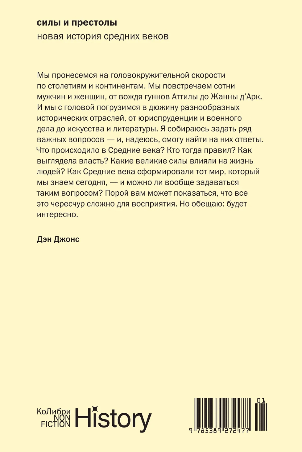 Viduslaiki bija laiks, kad antīkā pasaule nonāca barbaru uzbrukumā, kristietība no lokāla kulta pārtapa par spēcīgu reliģisku un politisku spēku, un tiesības, zinātne, kultūra un māksla piedzīvoja vienu radikālu pārveidi pēc otras, liekot pamatus mūsdienu realitātei. Vēsturnieks, žurnālists un TV vadītājs Dens Džounss aicina lasītājus aizraujošā ceļojumā cauri viduslaiku pasaulei – daudzpusīgajai Eiropai, slavenajām vēlās senatnes galvaspilsētām, ietekmīgajām islāma pasaules pilsētām –, iepazīstinot ar pagātnes dižciltīgajām personībām, sākot no Svētā Augustīna un Atilas līdz pat pravietim Muhamedam un Akvitānijas Eleonorai. Kā Lielā tautu pārvietošana mainīja pasauli? Kā dzīvoja mūki, bruņinieki un vienkāršie ļaudis? Kā viduslaiku Rietumi un Austrumi ietekmēja viens otru? Jūs uzzināsiet atbildes uz šiem un daudziem citiem jautājumiem patiesi plaša mēroga pētījumā par nemierīgu laikmetu, kas aptvēra veselu tūkstošgadi.