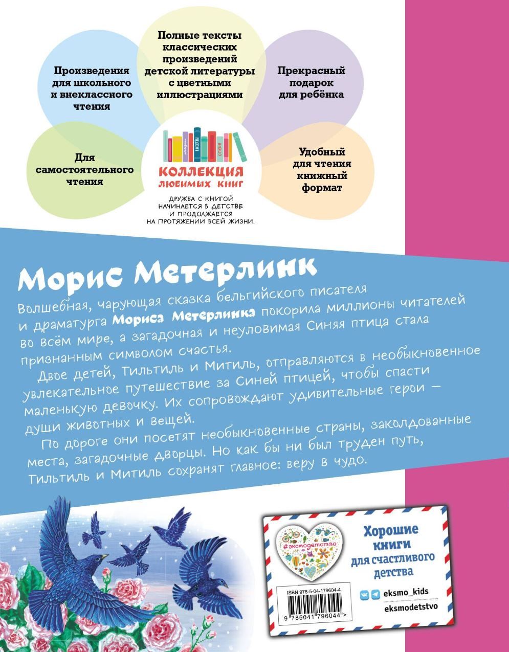 Beļģu rakstnieka Morisa Mēterlinka pasakā “Zilais putns” ir viss, kas bērniem patīk: skaista feja, brīnišķīgas pārvērtības, aizraujošs ceļojums, noslēpumi, mīklas, fantastiskas vietas un, protams, laimīgas beigas. Un tajā pašā laikā jaunie lasītāji saņems pārsteidzošas laipnības, drosmes, godīguma un uzticības nodarbības. “Esi drosmīgs, lai redzētu, kas ir apslēpts” ir viena no lieliska stāsta galvenajām idejām.