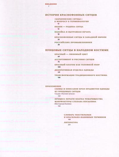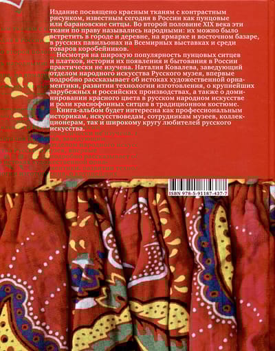 Publikācija ir veltīta sarkaniem audumiem ar kontrastējošu rakstu, kas Krievijā mūsdienās pazīstams kā puntsovye jeb baranovskie chintz. XIX gadsimta otrajā pusē šos audumus pamatoti dēvēja par tautas audumiem: tos varēja atrast pilsētā un ciemos, gadatirgū un austrumu tirdziņā, Krievijas paviljonos pasaules izstādēs un starp baileru precēm. Neraugoties uz plaši izplatīto karmīnsintēmu un lakatu popularitāti, to parādīšanās un izmantošanas vēsture Krievijā praktiski nav pētīta. Krievijas muzeja Tautas mākslas nodaļas vadītāja Natālija Kovaļeva pirmo reizi detalizēti stāsta par mākslinieciskā ornamenta pirmsākumiem, ražošanas tehnoloģijas attīstību, lielākajiem ārvalstu un Krievijas ražojumiem, kā arī par sarkanās krāsas dominanci krievu tautas mākslā un sarkano šindeļu lomu tradicionālajā tērpā. Grāmata-albums būs interesants gan profesionāliem vēsturniekiem, gan mākslas zinātniekiem, muzeju darbiniekiem, kolekcionāriem un plašam krievu mākslas cienītāju lokam.