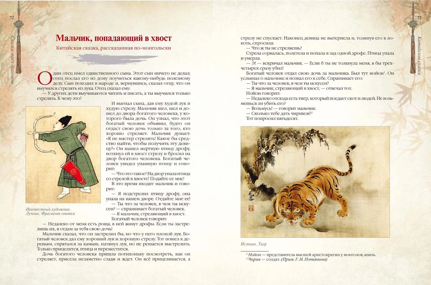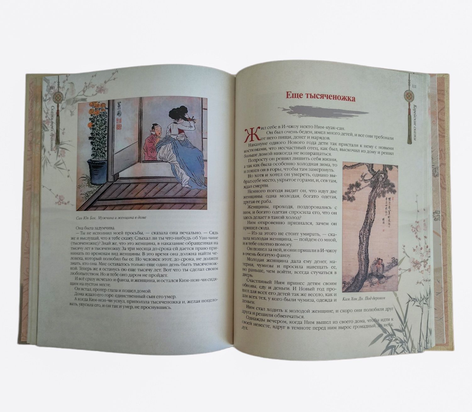 Šajā krājumā iekļautās ķīniešu, korejiešu un japāņu tautas pasakas atklās lasītājam Austrumāzijas senāko kultūru noslēpumaino un brīnumaino pasauli. It kā krāsainās krāsās uz smalka zīda viņa priekšā parādīsies varenie zemūdens valstības kungi un apburtās skaistās princeses, milzīgi biedējoši dēmoni un drosmīgi zēni pirksta lielumā, izmanīgi viltnieki un gudri zīlnieki, alkatīgi bagātnieki un izturīgi nabadzīgie cilvēki.... Grāmatā iekļautos darbus pirms vairāk nekā simts gadiem savāca, tulkoja un apstrādāja krievu rakstnieki un zinātnieki, daudzi no tiem kopš tā laika nav atkārtoti izdoti, un tagad tie atgriežas pie lasītājiem, lai atkal iepriecinātu ar savu spilgto eksotiku, aizraujošiem varoņu piedzīvojumiem un mūžīgo Seno Austrumu gudrību.