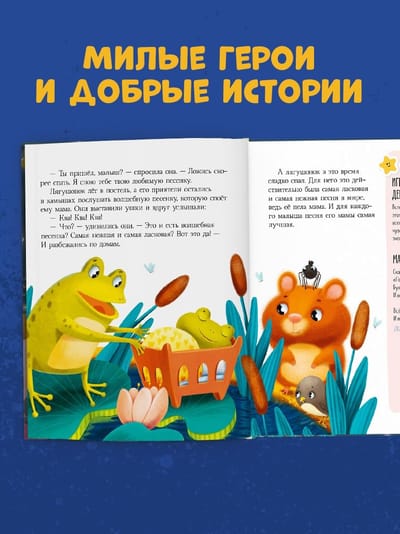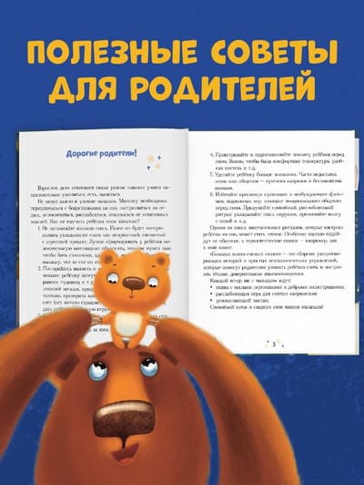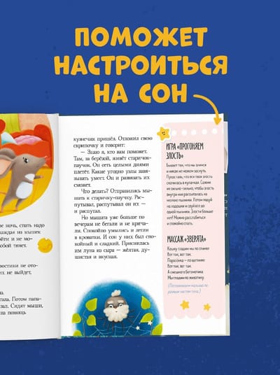 Nodaļas ar pasakām pavada vienkārši psiholoģiski vingrinājumi un taustes spēles. Jūs veiksiet masāžu, attēlojot pilošu lietu, vai zīmējiet uz plaukstām, maigi atslābinot bērnu un palīdzot viņam atbrīvoties no negatīvām domām un pāriet no nomoda uz miegu.