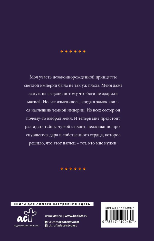 Mans kā Gaismas impērijas nelikumīgās princeses liktenis nebija nemaz tik slikts. Es pat nebiju precējusies, jo dievi man nedeva maģiju. Taču tas viss mainījās, kad pilī ieradās Tumšās impērijas mantinieks. No visām māsām viņš nez kāpēc izvēlējās mani. Un tagad man ir jāatšķetina svešas valsts noslēpumi, negaidīta dāvana un mana paša sirds, kas nolēma, ka šis nekaunīgais vīrietis ir īstais man.
