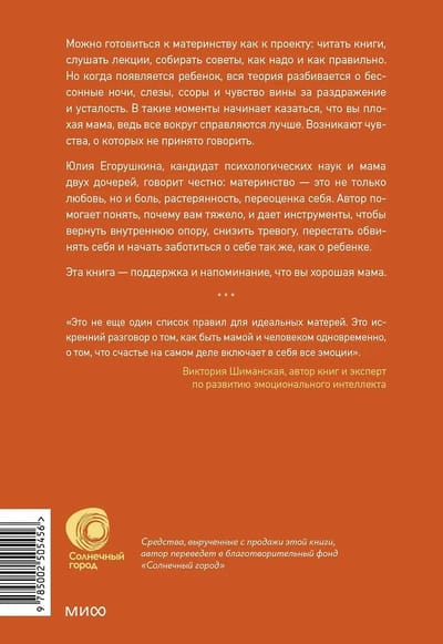 Jūlija Jegoruškina, psiholoģijas doktorante un divu meitu māte, atklāti saka: mātes loma nav tikai mīlestība, bet arī sāpes, apjukums un pašrefleksija. Viņa palīdz saprast, kāpēc tev ir grūtības, un sniedz instrumentus, lai atgūtu iekšējo atbalstu, mazinātu trauksmi, pārstātu vainot sevi un sāktu rūpēties par sevi tā, kā rūpētos par savu bērnu.