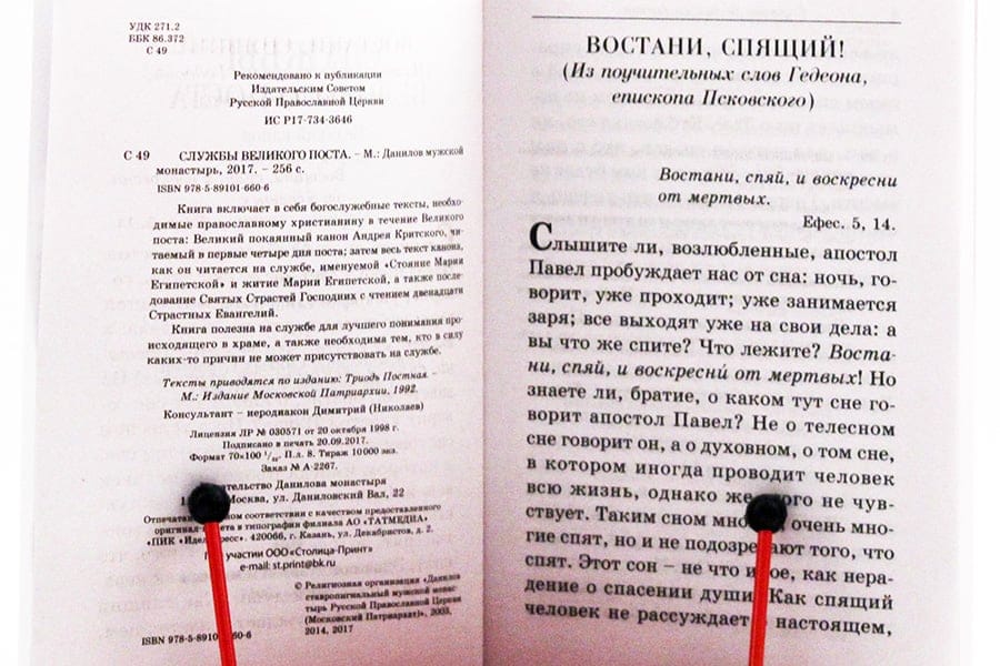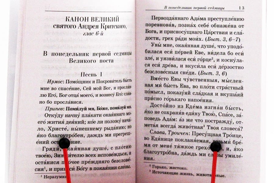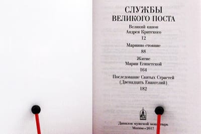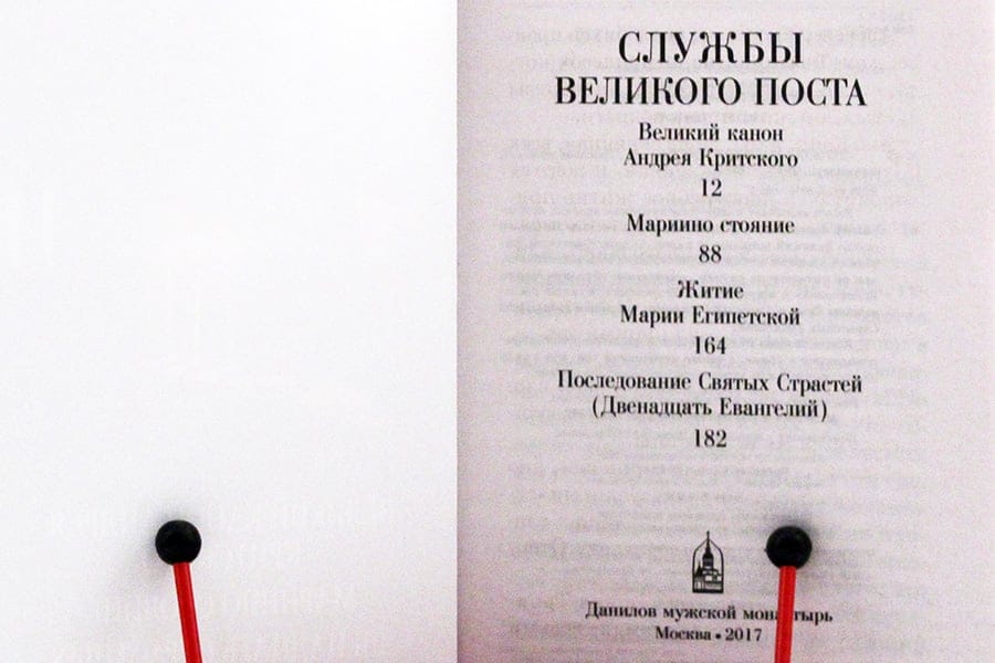 Grāmatā iekļauts Svētā Andreja Krētas Lielā kanona teksts, kas lasāms Pirmajās četrās gavēņa dienās, kam seko viss kanona teksts, kas tiek lasīts piektās nedēļas trešdienā, saukts "Marijas stāvēšana", Ēģiptes Marijas dzīve un Kunga Svēto ciešanu secība.