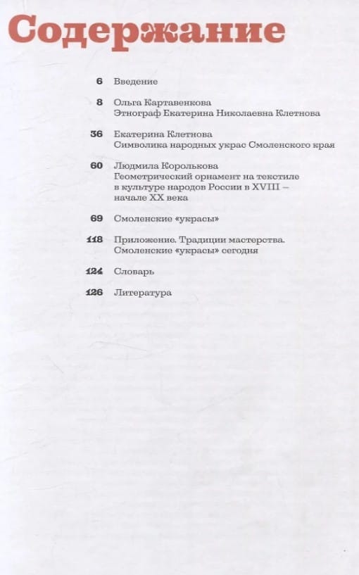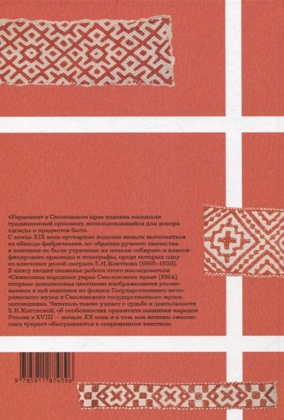 Izdevums veltīts krievu tautas izšūšanas mākslinieciskajai tradīcijai, izmantojot Smoļenskas “dekorāciju” piemēru, kā senatnē sauca apģērbu un sadzīves priekšmetu dekoratīvo dekoru. Grāmata iepazīstina ar ievērojamu izšūšanas pētījumu darbu, ko veica E.N. Kletnova, “Smoļenskas apgabala tautas rotājumu simbolika”, publicēts 1924.