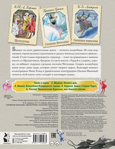 Pasaulē ir pārsteidzošas grāmatas – mazliet maģiskas. Tās spēj atdzīvināt dižu stāstnieku varoņus un padarīt lasītāju par piedzīvojumu dalībnieku. Vienkārši pāršķir lappusi – un te nu jūs cīnāties ar pelēm ar Riekstkodi, klejojat pa pasauli kopā ar Gerdu un vērojat, cik meistarīgi Blizzarda kundzes kalps uzpūš spilvenus. Tikai cilvēki, kas prot darīt brīnumus, var radīt maģisku grāmatu. Pateicoties Nikas Golcas maigajām ilustrācijām un Oksanas Ivanovas pārsteidzošajiem dizainiem, šīs grāmatas lasītājs viegli nonāks īstā pasakā...