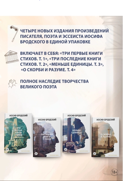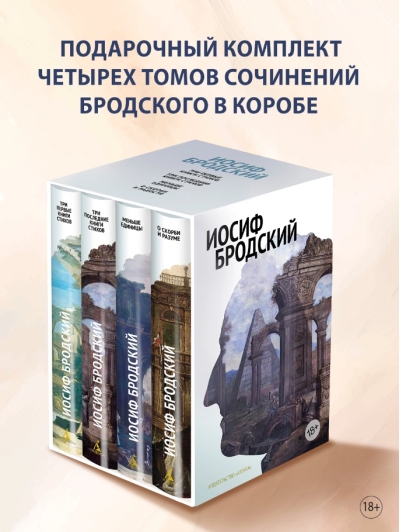 Šis izdevums veltīts Džozefa Brodska (1940–1996) jubilejai. Tajā iekļauti seši dzejas krājumi, ko izdevusi amerikāņu izdevniecība Ardis ("Apstāšanās tuksnesī", "Skaistā laikmeta beigas", "Runas daļa", "Jaunas strofas Augustai", "Urānija" un "Ainava ar plūdiem"), prozas krājumi "Mazāk nekā viens" un "Par bēdām un saprātu", kā arī eseja "Neārstējamā uzbērums". Balstoties uz autora sacerējumiem, šis četru sējumu krājums aptver galveno daļu no dižā dzejnieka radošā mantojuma.