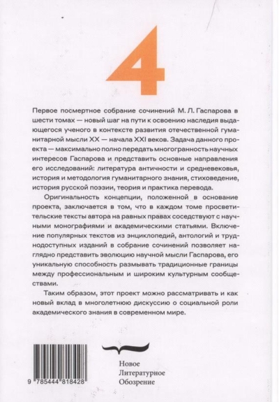 M. L. Gasparova pirmais pēcnāves kopotais darbs (sešos sējumos) tiecas pēc iespējas pilnīgāk atspoguļot viņa zinātnisko interešu daudzpusīgo apjomu un iepazīstināt ar viņa darba galvenajām jomām. Ceturtajā sējumā ir apkopoti viņa nozīmīgākie darbi par dzejniecību. Šī viņa zinātniskā mantojuma daļa ir pelnījusi īpašu uzmanību, jo ar Gasparova vārdu saistās ievērojama daļa krievu dzejniecības sasniegumu 20. gadsimta otrajā pusē. Šeit piedāvātā rakstu izlase nepretendē uz izsmeļošu rakstu, taču tai ir paredzēts būt pēc iespējas reprezentatīvākai. Papildus sen zināmiem klasikas darbiem šajā sējumā ir iekļauti arī nepelnīti mazpazīstami, tomēr ne mazāk nozīmīgi Gasparova darbi. Šie darbi, salīdzinot tos ar paša autora izvēlētiem tekstiem, iegūst jaunu kvalitāti. Šie darbi ir iegūti no ierobežotiem tirāžām un līdz šim lielākajai daļai lasītāju ir bijuši grūti pieejami. Šeit ir sniegti arī viņa enciklopēdiskie raksti, kuros skaidri un kodolīgi formulētas viņa dzejniecības pamatjēdzienu definīcijas. M. L. Gasparova darbi par dzejoļu rakstīšanas praksi joprojām ir vieni no svarīgākajiem uzziņu avotiem visiem dzejoļu vēstures un teorijas speciālistiem.