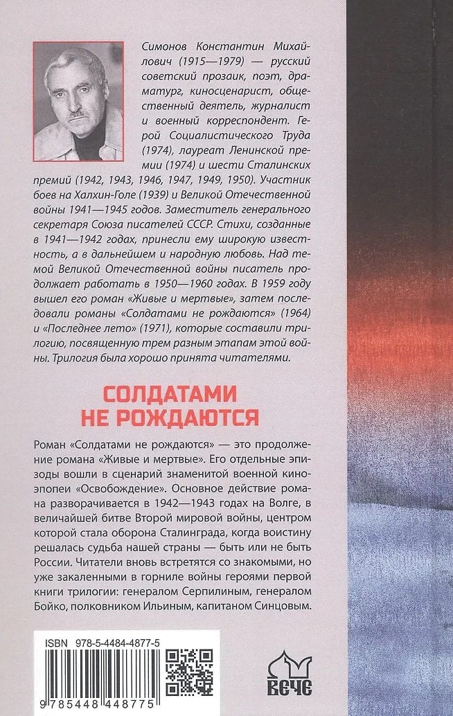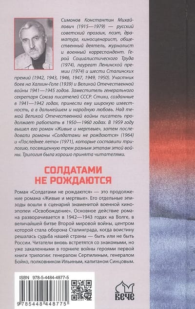 Romāns "Karavīri nedzimst" ir turpinājums romānam "Dzīvie un mirušie". Atsevišķas romāna epizodes tika iekļautas slavenās kara filmas "Atbrīvošana" scenārijā. Romāna galvenā darbība risinās 1942.-1943. gadā pie Volgas, Otrā pasaules kara lielākās kaujas laikā, kuras centrā bija Staļingradas aizstāvēšana, kad patiesi tika izlemts mūsu valsts liktenis — vai Krievija pastāvēs vai nepastāvēs. Lasītāji atkal sastapsies ar pazīstamiem varoņiem no triloģijas pirmās grāmatas, kas tagad kaldināti kara krāsnī: ģenerāli Serpilin, ģenerāli Boiko, pulkvedi Iļjinu un kapteini Sincovu.