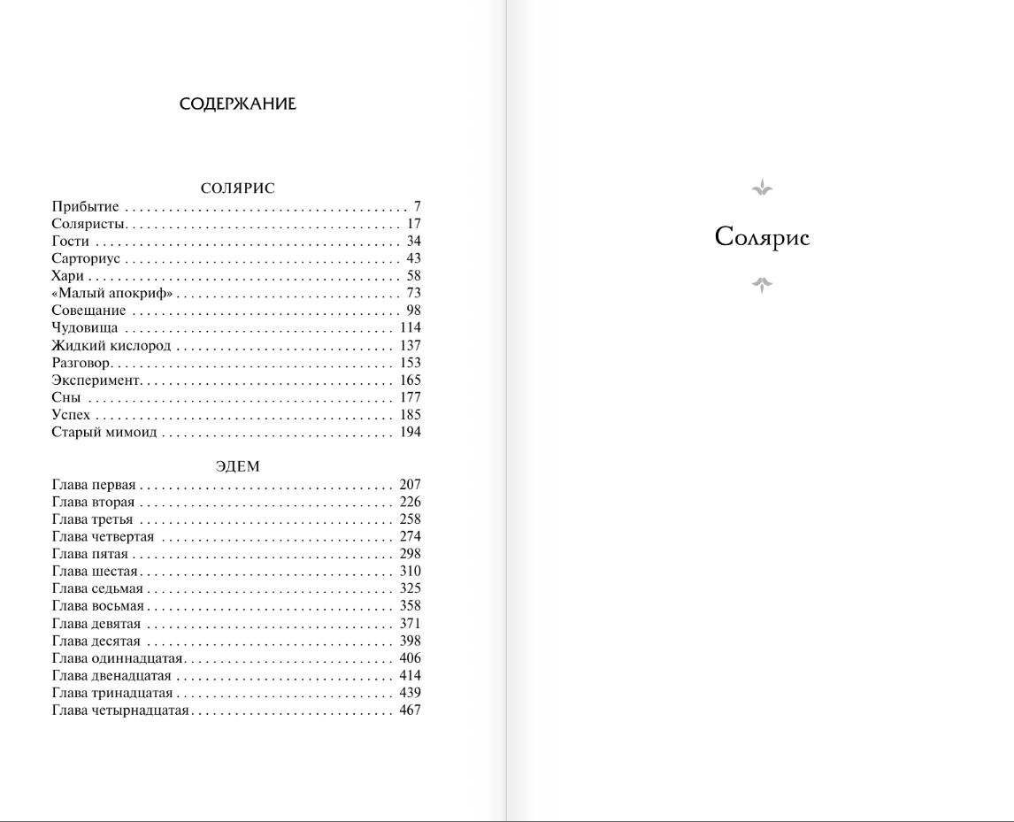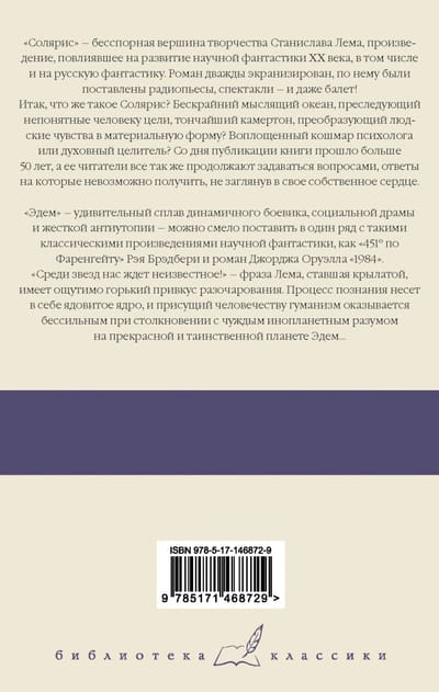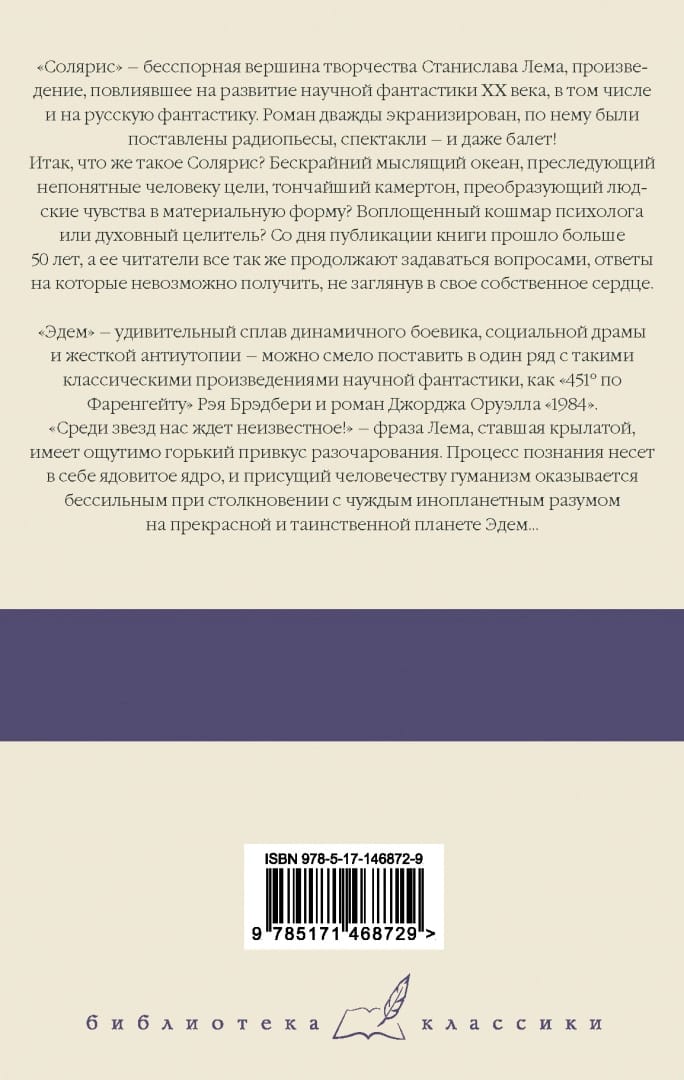 Solaris ir neapstrīdama Staņislava Lema daiļrades virsotne, kas ietekmēja 20. gadsimta zinātniskās fantastikas, tostarp krievu zinātniskās fantastikas, attīstību. Romāns ir divreiz ekranizēts, ir uzņemtas radio lugas, lugas - un pat balets! Tātad, kas ir Solaris? Bezgalīgs domājošs okeāns, kas tiecas pēc nesaprotamiem mērķiem, smalks skaņotājs, kas cilvēku jūtas pārvērš materiālā formā? Psihologa vai garīgā dziednieka iemiesots murgs? Kopš grāmatas iznākšanas pagājuši vairāk nekā 50 gadi, un tās lasītāji joprojām turpina uzdot jautājumus, uz kuriem atbildes nevar iegūt, neieskatoties savā sirdī. "Ēdeni" - pārsteidzošu dinamiskas asa sižeta filmas, sociālās drāmas un skarbas distopijas sakausējumu - droši var likt vienā līmenī ar tādiem zinātniskās fantastikas klasikas darbiem kā Reja Bredberija "451 ° Fārenheita" un Džordža Orvela romānu "1984". "Starp zvaigznēm mūs gaida nezināmais!" - Lema frāzei, kas kļuvusi par saukli, ir jūtami rūgta vilšanās piegarša. Izziņas procesam ir indīgs kodols, un cilvēcei piemītošais humānisms ir bezspēcīgs, saskaroties ar svešzemju inteliģenci uz skaistās un noslēpumainās planētas Eden.....