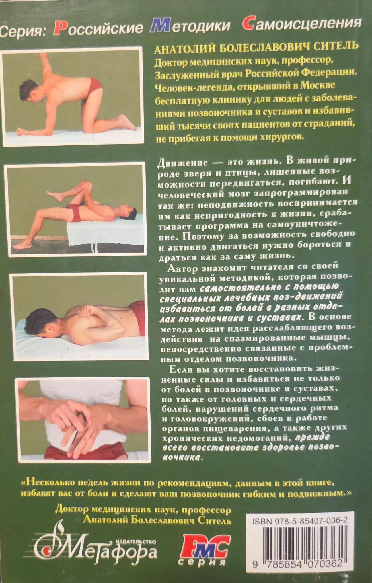 Savā grāmatā "Solo mugurkaulam" profesors Anatolijs Sitels iepazīstina lasītāju ar savu unikālo pašdziedināšanās metodi, kas ļauj lasītājam patstāvīgi, izmantojot specifiskas terapeitiskas pozas un kustības, īsā laikā mazināt sāpes dažādās mugurkaula un locītavu daļās un atjaunot to lokanību un kustīgumu. Šī mugurkaula un locītavu sāpju pašpārvaldes metode balstās uz relaksācijas ideju, terapeitiski iedarbojoties uz spazmotīvo muskuli vai muskuļu grupu, kas tieši saistīta ar problemātisko mugurkaula vai locītavas daļu.