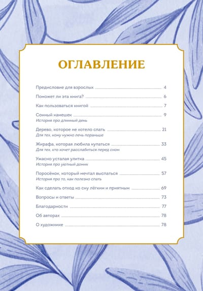 Pasaules miega ekspertes Alises Gregorijas un bērnu grāmatu autores Kristijas Kirkpatrikas (Christy Kirkpatrick) mierinošu stāstu un efektīvu relaksācijas paņēmienu kolekcija. Siltas, nomierinošas pasakas par miegaino Pebbles, vectētiņu Oak, jauko gliemezi Ole, jautro žirafi Gabrielle un smieklīgo sivēntiņu Paul nomierinās jūsu bērnu aizmigt. Stāsti ir balstīti uz zinātniskiem pētījumiem, miega ekspertu un psihologu ieteikumiem. Katrā no tiem apvienoti trīs relaksācijai noderīgi elementi: iztēle: bērns varēs līdz sīkākajām detaļām iztēloties stāstā aprakstīto notikumu. Iedomātā aina viņu aizraus, un traucējošām domām nebūs vietas. Muskuļu relaksācijas vingrinājumi - efektīva nemedikamentoza metode cīņā ar bezmiegu. Apzinātības prakse - palēnināt tempu, būt mirklī. Būt mirklī nozīmē pamanīt, pirmkārt, savas fiziskās sajūtas, otrkārt, domas, kas ienāk galvā, un, treškārt, apkārtējo vidi (piemēram, gaisa temperatūru vai skaņas). Nesodoša uzmanība mazinās trauksmi un atslābinās jūsu mazuli. Grāmatas beigās sniegti padomi vecākiem. Jūs uzzināsiet, kas ir "snaudiena" diēta, kāda loma veiksmīgā iemidzināšanā ir vēsumam un aptumšotai gaismai, kā arī to, kad doties gulēt. Strādājot pie grāmatas, autori veica pētījumu, kurā piedalījās 100 ģimenes ar bērniem vecumā no 3 līdz 11 gadiem. Vecāki tika lūgti trīs vakarus pēc kārtas saviem bērniem izlasīt stāsta "Miegaino akmentiņu" pirmo versiju. Pēc tam dalībniekiem tika lūgts atbildēt uz jautājumiem, no kuriem galvenais bija "Kāda bija stāsta lasīšanas kopējā ietekme uz jūsu bērna miegu?". Pamatojoties uz atbildēm, 80 no 104 bērniem (77%) uzrādīja pozitīvu ietekmi. Dodieties zem segas jau drīzumā - Miegammiega pasakas gaida jūs! Labas nakts un saldus sapņus. No autoriem: Mēs iesakām katru vakaru izvēlēties vienu stāstu un lasīt to tieši pirms gulētiešanas. Kad ir pienācis laiks lasīt, aiciniet bērnu pagulties, aizvērt acis un kādu brīdi būt klusumā. Centieties lasīt mierīgā, nomierinošā balsī, lēni un klusi. Paskaidrojiet, ka šī ir īpaša, "miegaina" grāmata, ka tā atšķiras no tām, ko parasti lasāt, un ka to vajadzētu klausīties, guļot gultā. Stāsti un prakses palīdzēs jūsu bērnam atpūsties pirms gulētiešanas. Pēc stāsta pabeigšanas jums vajadzētu izslēgt gaismu un censties, lai guļamistabā būtu klusums. Tagad ir laiks novēlēt bērniem saldus sapņus.