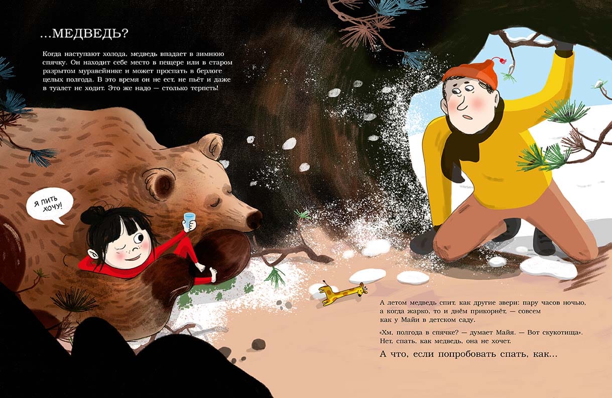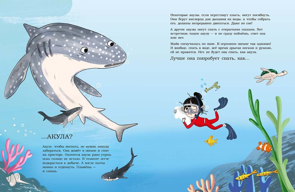 Tētis aicina Maiju gulēt, bet viņai ir tik daudz darāmā! Un kāpēc viņai katru vakaru jāiet gulēt? Tas ir tik garlaicīgi! Daudz jautrāk ir gulēt ar galvu uz leju uz koka zara kā sikspārnim. Vai arī gliemežvāku čaulā kā gliemezis: tu vari jebkurā mirklī uzkāpt mājā uz muguras un gulēt dienu vai divas. Cik ērti! Vai arī gulēt okeānā ar atvērtām acīm kā haizivs. Jūs peldat un guļat. Vai gulēt uz muguras kā ūdrs, ieskaujot visu savu ģimeni un turoties viens otram ar ķepām. Tas ir skaisti! Vai arī kā morss, kas aizmigst jebkurā vietā un jebkurā pozīcijā. Vai kā lācis, kurš guļ visu ziemu un nezina, kas ir aukstums, sniegs un vējš. Bet vasarā viņš guļ ļoti maz. Vai tas nav lieliski? Tāpēc Maija nolemj pamēģināt! Taču beigās viņa saprot, ka negrib gulēt sasalušos dubļos kā vardīte. Un viņa nevar gulēt stāvus kā zebra. Viņai vajag vairāk miega nekā žirafai, bet mazāk nekā lācim. Izmēģinājusi visu, viņa atceras savu silto gultiņu un nolemj, ka labāk gribētu gulēt kā mazulis! Bērnu literatūrā nav daudz grāmatu par dzīvniekiem, kas stāsta par to, kā guļ dažādi dzīvnieku pasaules pārstāvji. Sekojot Maijai, bērns uzzina par sikspārņa, gliemeža, haizivs, ūdra, lāča, žirafes, zebras, morsa, pīles, seska, seska, vardes... un cilvēka miega paradumiem!