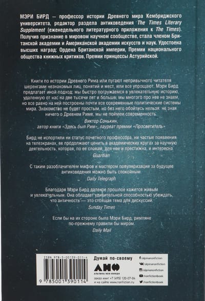 Senā Roma ir tēma, kas izraisa vispārēju interesi, un pieredze ar tās tēliem un vēsturi pavada mūs zinātnē, literatūrā un mākslā. Bet cik tuvu realitātei ir mūsu priekšstati par šo laikmetu? Šī grāmata, ko sarakstījusi viena no pasaules vadošajām antīkās vēstures ekspertēm Mērija Bērada, neizbēgami mainīs daudzus no tiem. Senāts un tauta, Cicerons un Katilīns, Hanibals, Cēzars, Kleopatra, Augusts un Nerons ... Aprakstot varas un cilvēka attiecības, politisko iekārtu un konfliktus, valstiskuma un impērijas veidošanos, slavenus un nezināmus romiešus, autors sagrauj daudzus mītus, liek citādi paraudzīties uz daudziem senās vēstures notikumiem. Šeit ir viss labākais, ko lasītājs var atrast populārzinātniskajā literatūrā: dziļas un vispusīgas zināšanas par tēmu, izcila stāstnieka valoda, spēja nodot ikdienas dzīves pulsu. Lasot par tālo pagātni, mēs iejūtamies tajā tā, it kā lasītu Cicerona dienasgrāmatu, it kā spēlētu kauliņus Pompeja krogā.