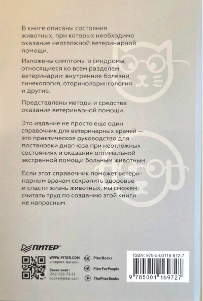 Šajā grāmatā, izmantojot simptomu-sindromu principu, ir aprakstīti stāvokļi, kuriem nepieciešama neatliekamā veterinārā palīdzība. Tajā ir aplūkoti simptomi un sindromi visās jomās: iekšķīgajās slimībās, ginekoloģijā, otolaringoloģijā un citās. Tajā ir aprakstītas arī metodes un rīki veterinārās aprūpes sniegšanai.