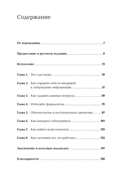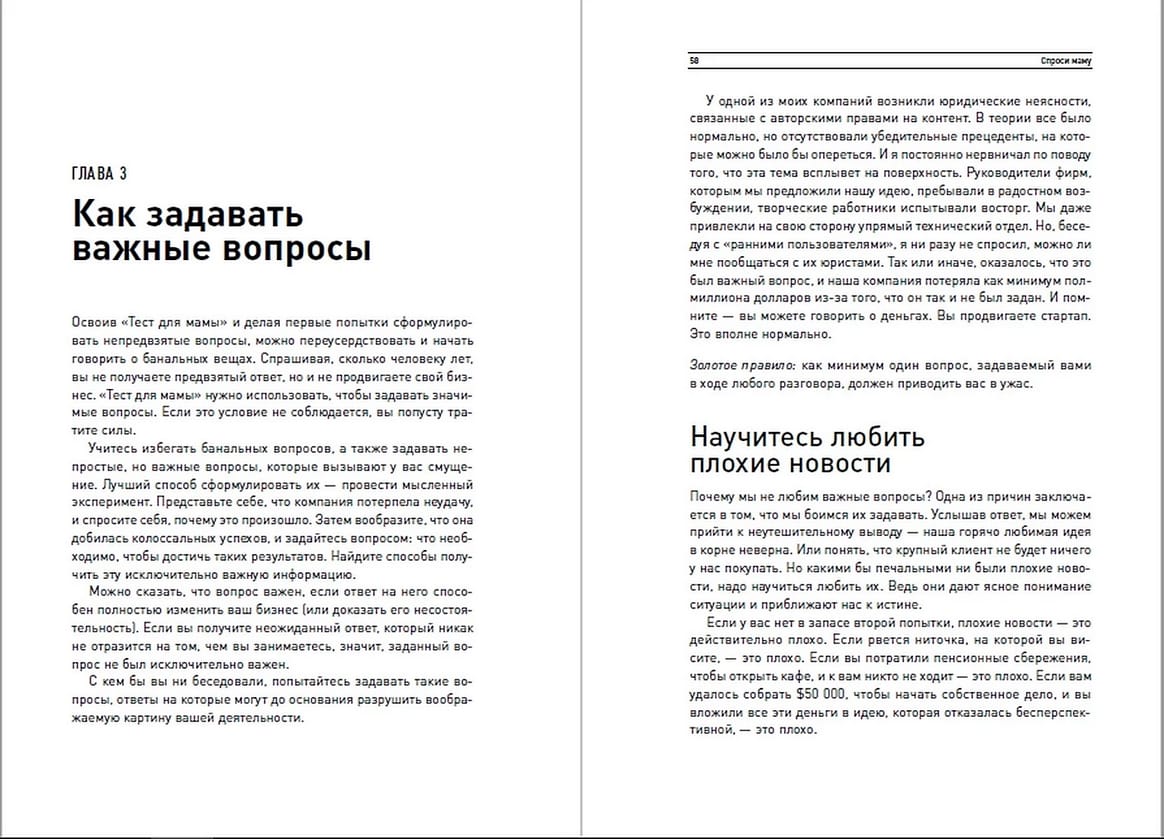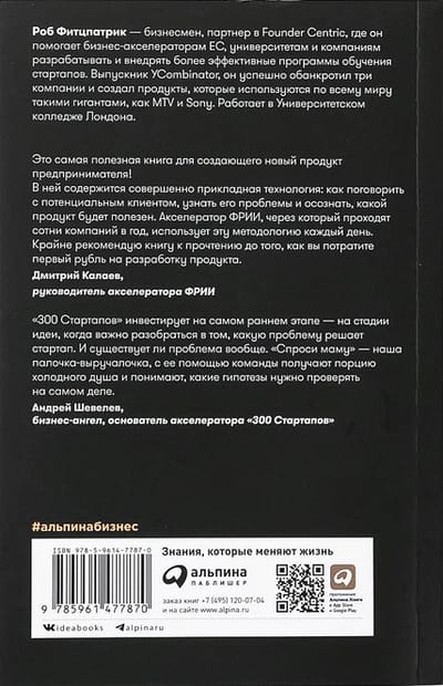Stīvs Blanks, jaunuzņēmumu kustības guru, saka, ka vissvarīgākais topošajam uzņēmējam ir "izkļūt no biroja", proti, sākt tieši no klientiem uzzināt, kas viņiem ir nepieciešams. Tomēr tas, vai jūs iegūstat patiešām svarīgu informāciju, ir atkarīgs no tā, kādus jautājumus uzdodat. Starp citu, vispopulārākais jautājums - "Vai jums patīk mūsu ideja vai produkts?". - ir nepareizs. Tas ir tāpat kā jautāt mammai, vai viņai patīk jūsu ideja: viņa jūs mīl un tik un tā jūs slavēs, negribot jūs sarūgtināt. Tā rīkojas arī 99 % klientu. Kopumā, lai kļūtu par veiksmīgu uzņēmēju, jums ir jāzina, kā un ko tieši jautāt, un Roba Fitzpatrika grāmata jums iemācīs, kā to darīt! Autors palīdzēs jums saprast, kad atbilde tiek sniegta no pieklājības un tai nav nekādas vērtības, pastāstīs, kādā virzienā attīstīt sarunu, kādus precizējošos jautājumus uzdot, kā izvairīties no sociāli nevēlamām atbildēm, kā saprast, kas produktā ir labs vai slikts, vai tas ir vajadzīgs tirgum, kā to pareizi pozicionēt - un tas viss ar daudziem reāliem piemēriem. Jūsu priekšā ir kodolīgs, noderīgs un ar humoru uzrakstīts praktisks ceļvedis efektīvai komunikācijai starp uzņēmēju un viņa klientiem. Tas palīdzēs jums ietaupīt laiku, naudu un nervus.