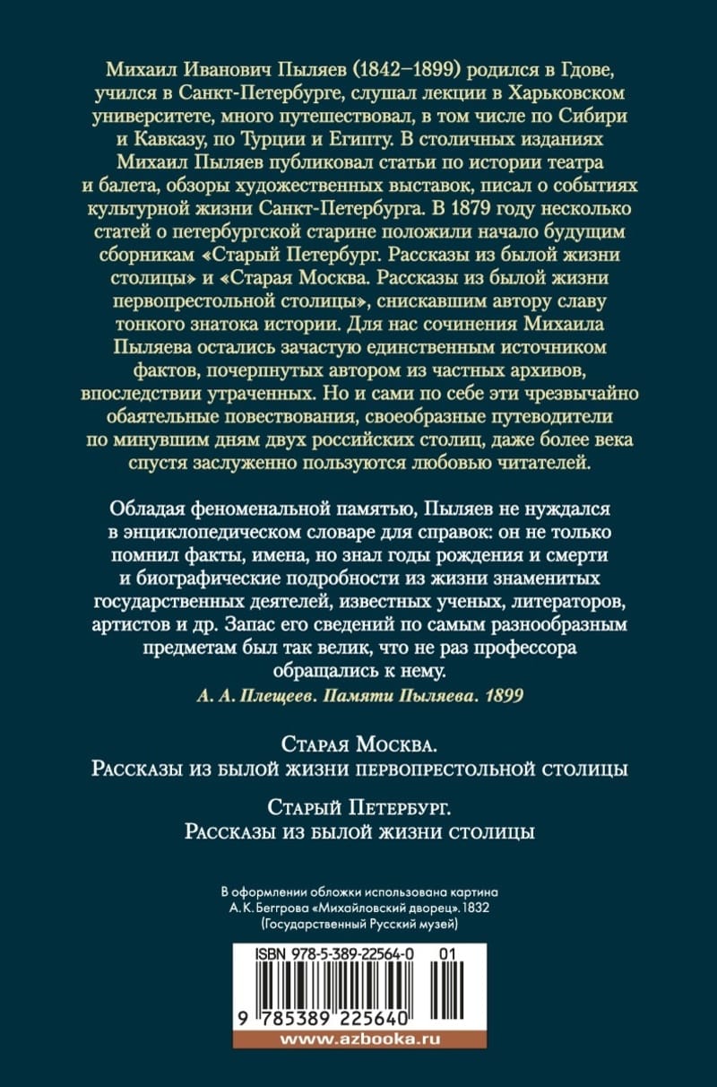 Mihails Ivanovičs Pilajevs (1842-1899) dzimis Gdovā, studējis Pēterburgā, klausījies lekcijas Harkovas universitātē, daudz ceļojis, tostarp pa Sibīriju un Kaukāzu, Turciju un Ēģipti. Metropoles izdevumos Mihails Piļajevs publicēja rakstus par teātra un baleta vēsturi, mākslas izstāžu recenzijas, rakstīja par Sanktpēterburgas kultūras dzīves notikumiem. Vairāki raksti par Sanktpēterburgas senatni 1879. gadā lika pamatus topošajiem krājumiem "Senā Pēterburga. Stāsti no kādreizējās galvaspilsētas dzīves" un "Senā Maskava. Stāsti no kādreizējās galvaspilsētas dzīves", kas autoram izpelnījās smalka vēstures pazinēja slavu. Mums Mihaila Pilajeva darbi bieži vien ir palikuši vienīgais avots, kurā atrodami autora no privātajiem arhīviem smelti, vēlāk pazaudēti fakti. Taču arī pēc vairāk nekā gadsimta šie ārkārtīgi burvīgie stāstījumi, savdabīgi ceļveži pa aizgājušajiem abu Krievijas galvaspilsētu laikiem, ir pelnīti iemīļoti lasītāju vidū.