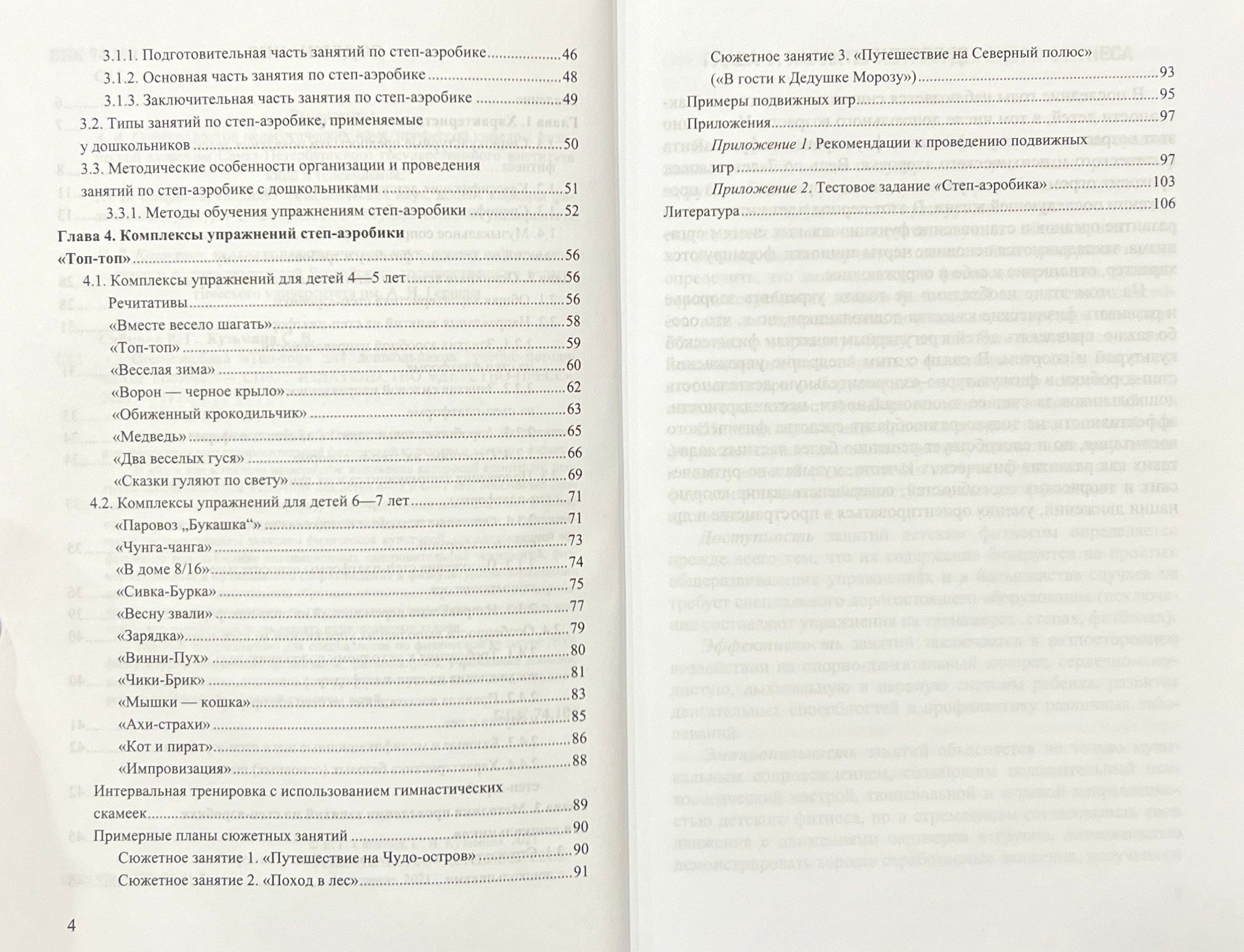 Publikācijā ir apkopota labākā pieredze, kas uzkrāta veselības veicināšanas fiziskās kultūras un bērnu fiziskās sagatavotības teorijā un praksē. Grāmatā detalizēti izklāstīta autores izstrādātā step-aerobikas programmu "Top-top" koncepcija 4-5 un 6-7 gadus veciem bērniem, pamatota fitnesa loma pirmsskolas vecuma bērnu fiziskās audzināšanas modernizācijā ar mērķi uzlabot veselību, paaugstināt fiziskās sagatavotības līmeni un piesaistīt sistemātiskai fiziskajai audzināšanai, kas nozīmē inovatīvu veselību veicinošu tehnoloģiju, fitnesa tehnoloģiju un muzikālā pavadījuma efektīvu izmantošanu bērnu fiziskajā audzināšanā. Izdevumā ir sniegti figurāli stepa aerobikas vingrinājumu kompleksi, kurus var izpildīt uz vingrošanas soliņiem un masāžas paklājiem, kas ļauj risināt dažādus uzdevumus. Rokasgrāmata paredzēta pirmsskolas izglītības iestāžu fizkultūras speciālistiem, fizkultūras un sporta organizācijām, fitnesa klubiem, papildu izglītības iestādēm, fizkultūras augstskolu studentiem, kā arī visiem tiem, kurus interesē bērnu fizkultūras problēmas.