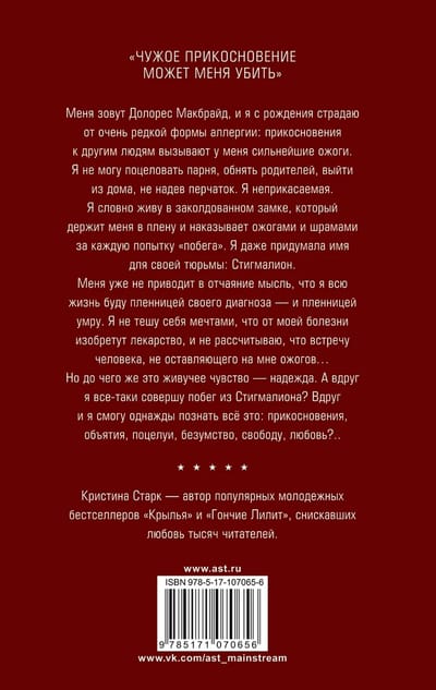 Mani sauc Doloresa Makbraida, un kopš dzimšanas esmu cietusi no ļoti retas alerģijas formas: pieskaroties citiem cilvēkiem, es izsaucu smagus apdegumus. Es nevaru noskūpstīt savu draugu, apskaut vecākus vai iziet no mājas, nevalkājot cimdus. Es esmu neaizskarams. Tas ir tā, it kā es dzīvotu apburtā pilī, kas mani tur gūstā un soda ar apdegumiem un rētām par katru mēģinājumu "aizbēgt". Viņa pat izdomāja savam cietumam nosaukumu: Stigmalion.