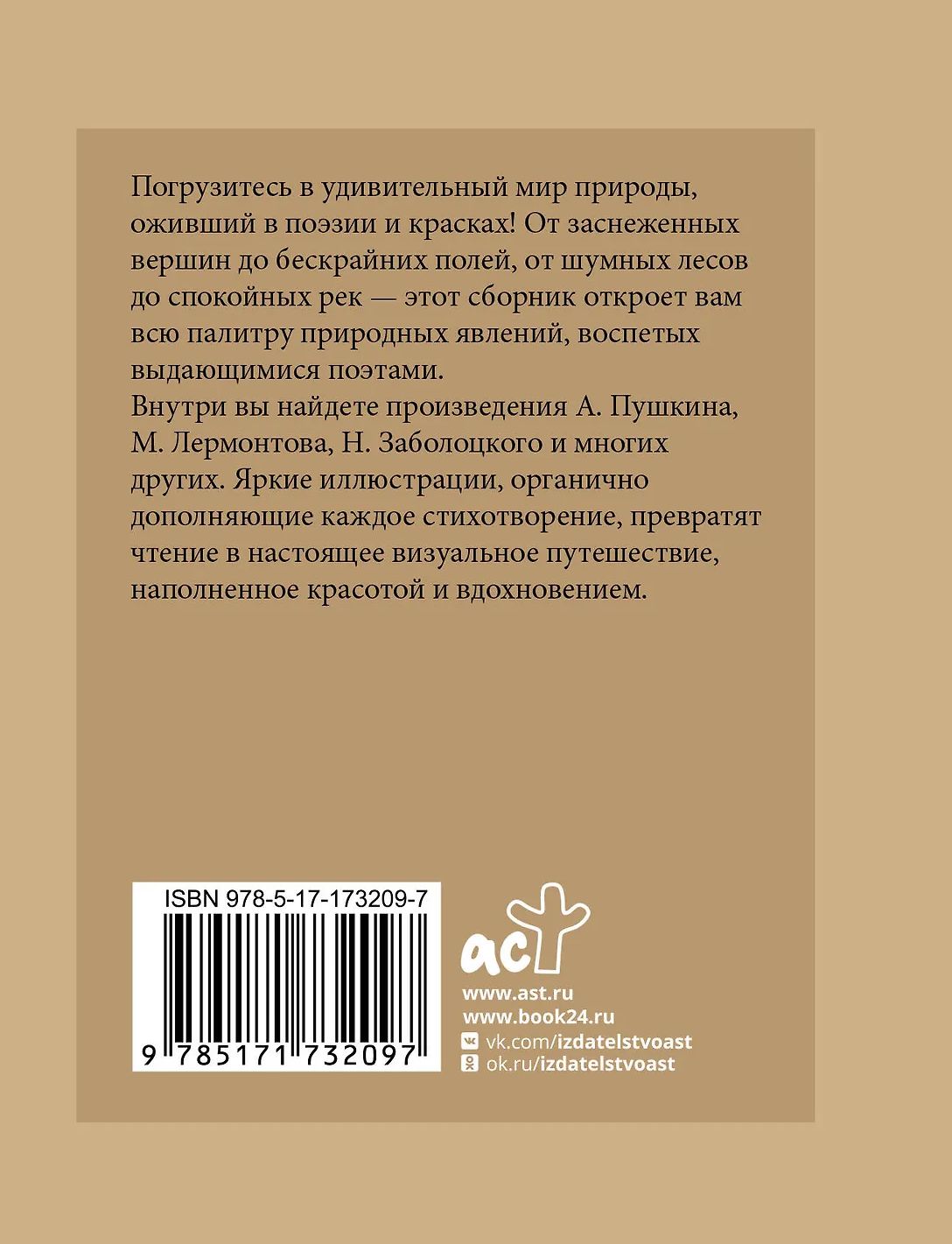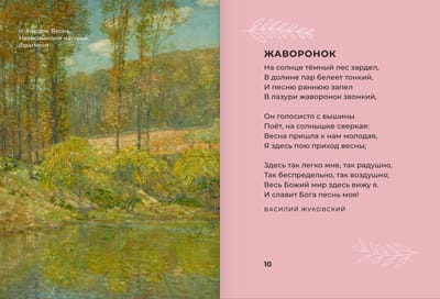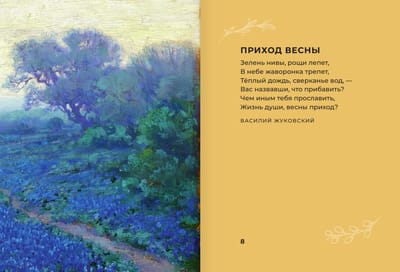 Iekšpusē atradīsiet A. Puškina, M. Ļermontova, N. Zabolotska un daudzu citu autoru darbus. Spilgtas ilustrācijas, kas nemanāmi papildina katru dzejoli, pārvērtīs jūsu lasīšanu par patiesu vizuālu ceļojumu, kas piepildīts ar skaistumu un iedvesmu.