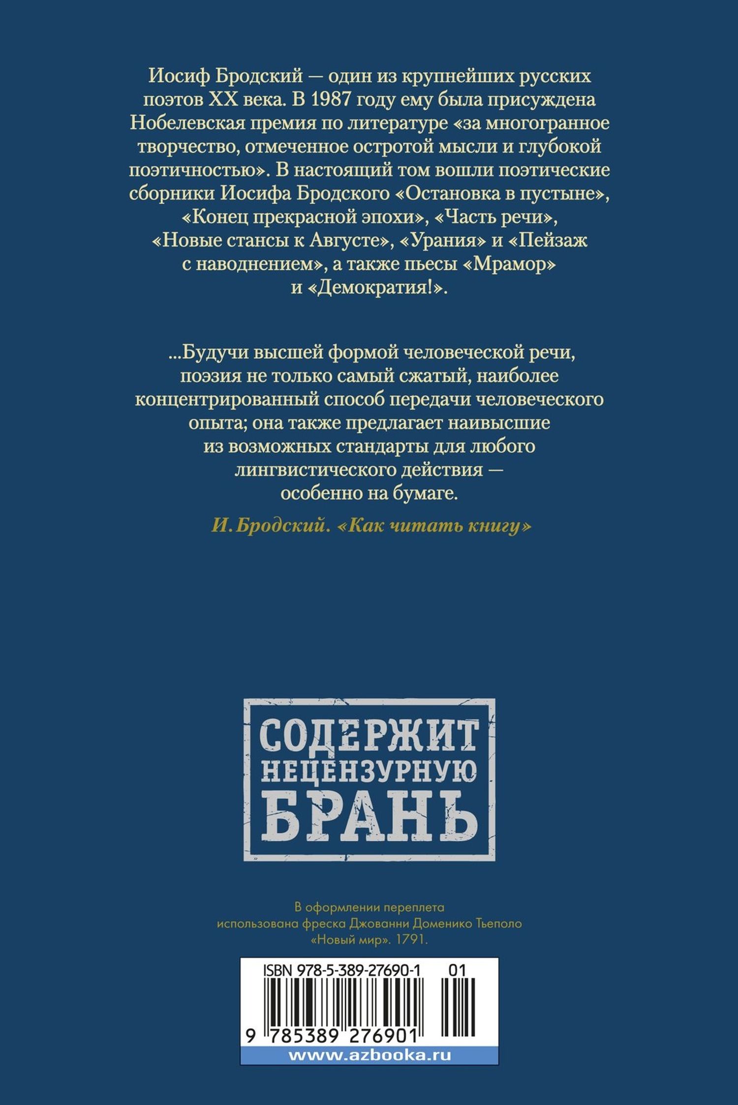 Džozefs Brodskis ir viens no izcilākajiem 20. gadsimta krievu dzejniekiem. 1987. gadā viņam tika piešķirta Nobela prēmija literatūrā "par viņa daudzpusīgo darbu, ko raksturo domu asums un dziļa dzeja". Šajā sējumā iekļauti Džozefa Brodska dzejas krājumi: “Pietura tuksnesī”, “Skaista laikmeta beigas”, “Runas daļa”, “Jaunas stanzas Augustam”, “Urānija” un “Ainava ar plūdiem”, kā arī lugas “Marmors” un “Demokrātija!”