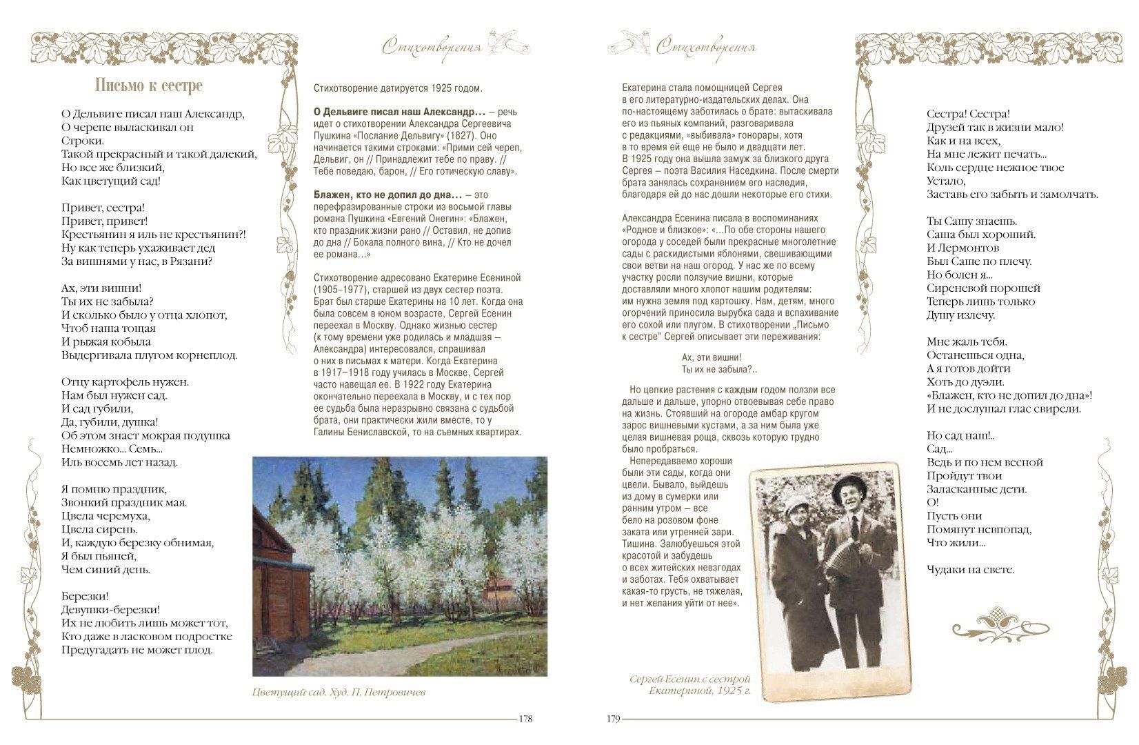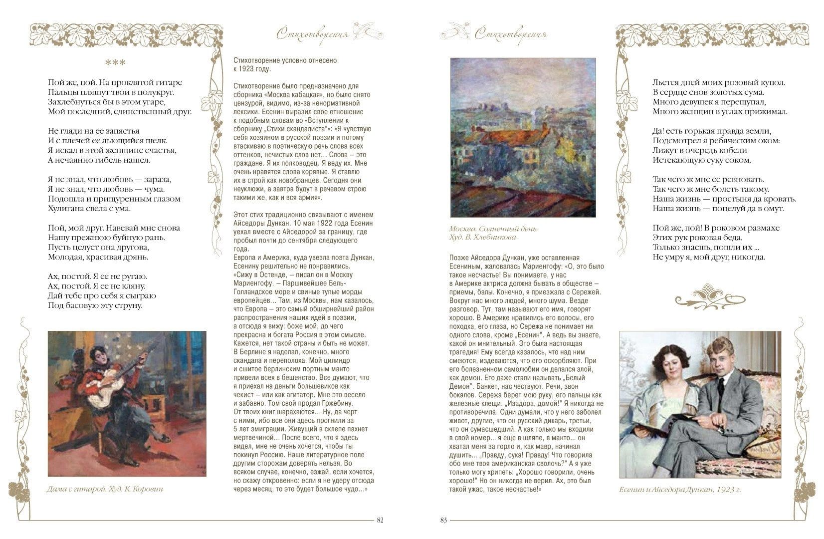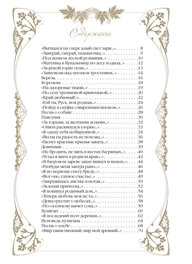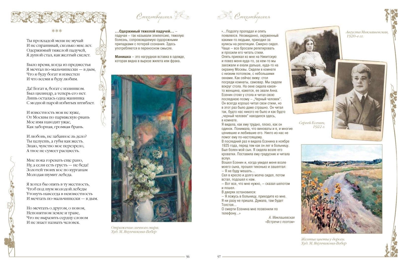 Grāmatā apkopoti vairāk nekā 110 Sergeja Jeseņina labākie dzejoļi ar detalizētiem komentāriem par katru darbu. Tie ir ilustrēti ar krievu glezniecības šedevriem, kā arī retām dzejnieka un viņa svītas fotogrāfijām. Jūs uzzināsiet par dzejoļu tapšanas vēsturi un ar tiem saistītajiem notikumiem Jeseņina dzīvē, kā arī iepazīsiet viņa dzejas adresātus – viņa draudzenes un mīļotās sievietes. Laikabiedru liecībās jums atklāsies jaunas Jeseņina biogrāfijas detaļas – "varbūt krieviskākais dzejnieks," kā par viņu rakstīja Jevgēņijs Jevtušenko.