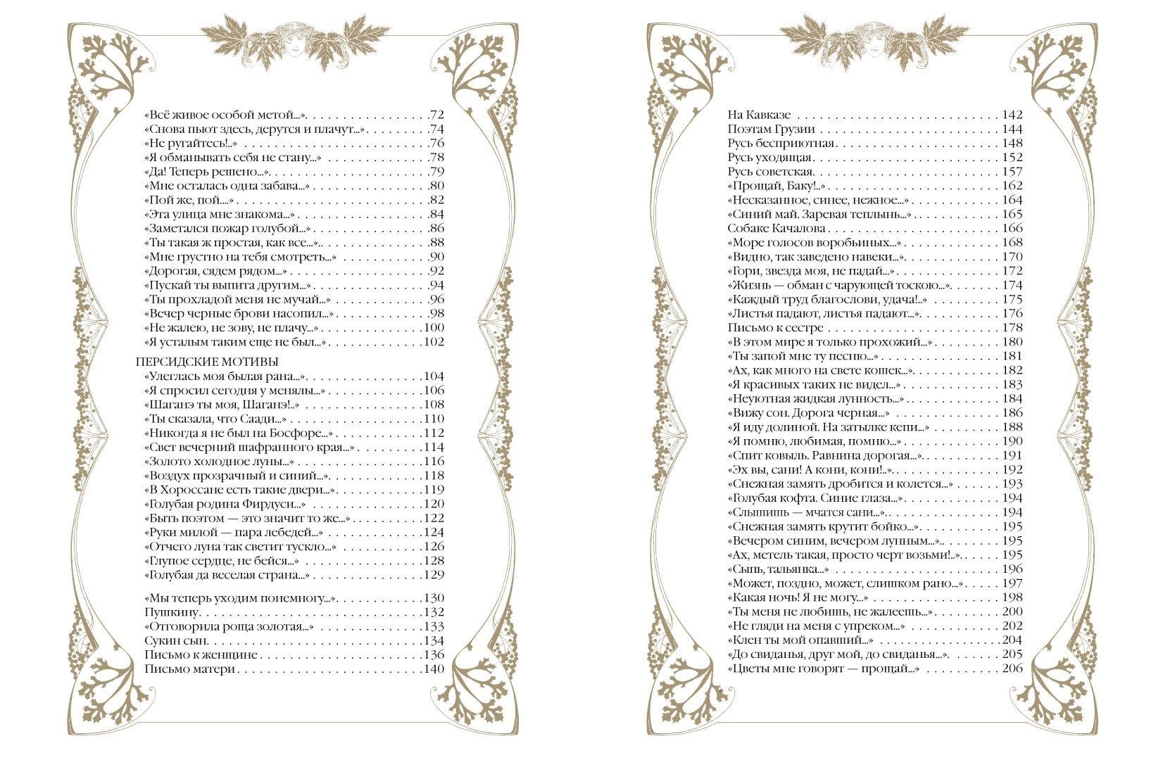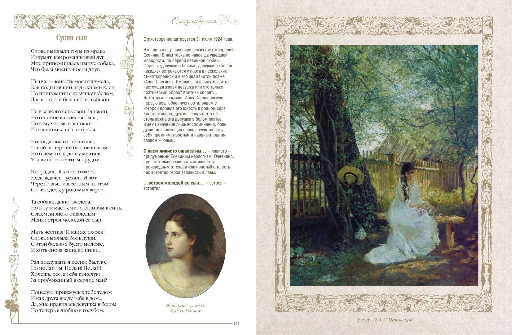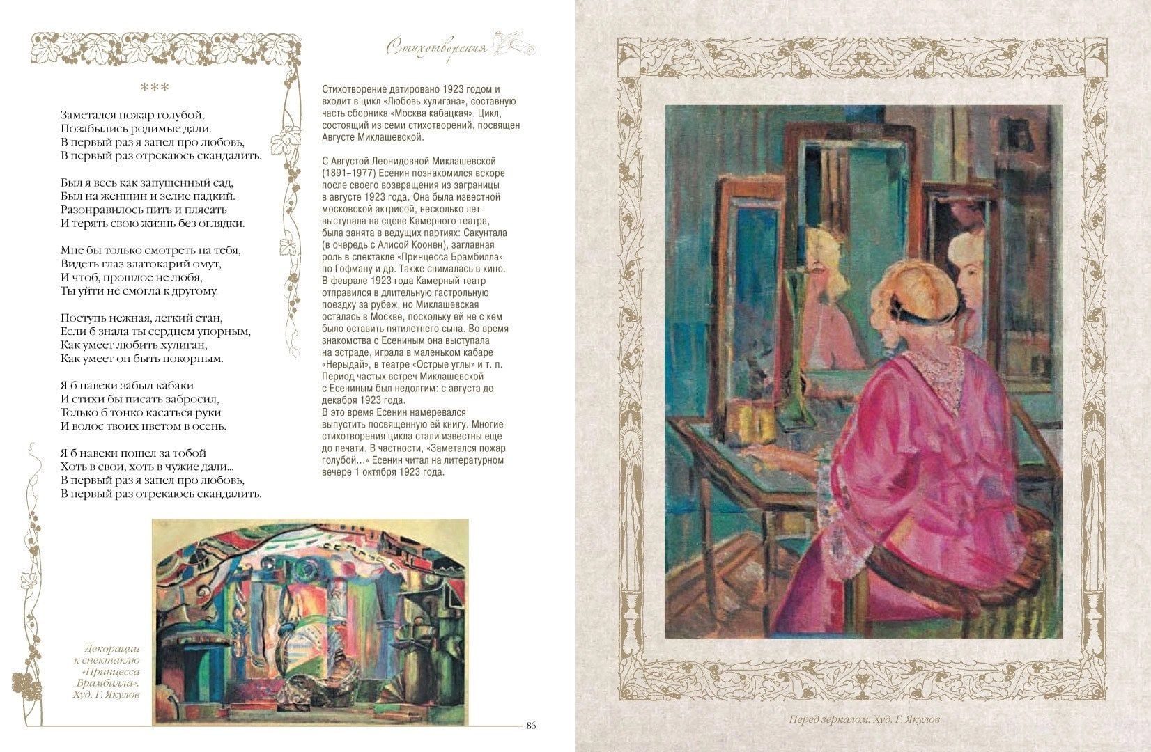 Grāmatā apkopoti vairāk nekā 110 Sergeja Jeseņina labākie dzejoļi ar detalizētiem komentāriem par katru darbu. Tie ir ilustrēti ar krievu glezniecības šedevriem, kā arī retām dzejnieka un viņa svītas fotogrāfijām. Jūs uzzināsiet par dzejoļu tapšanas vēsturi un ar tiem saistītajiem notikumiem Jeseņina dzīvē, kā arī iepazīsiet viņa dzejas adresātus – viņa draudzenes un mīļotās sievietes. Laikabiedru liecībās jums atklāsies jaunas Jeseņina biogrāfijas detaļas – "varbūt krieviskākais dzejnieks," kā par viņu rakstīja Jevgēņijs Jevtušenko.