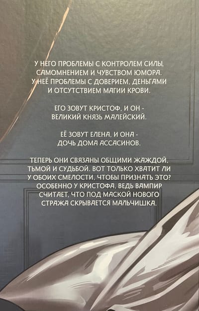 Viņam ir problēmas ar varas kontroli, ego un humoru. Viņai ir problēmas ar uzticēšanos, naudu un asins maģijas trūkumu. Viņu sauc Kristofs, un viņš ir Malejas lielkņazs. Viņas vārds ir Elena, un viņa ir slepkavu dzimtas meita. Un tagad viņus saista kopīgas slāpes, tumsa un liktenis. Bet vai viņiem abiem pietiks drosmes to atzīt? Īpaši Kristofam, jo vampīrs uzskata, ka jaunais sargs patiesībā ir zēns.