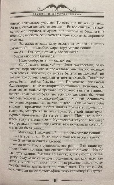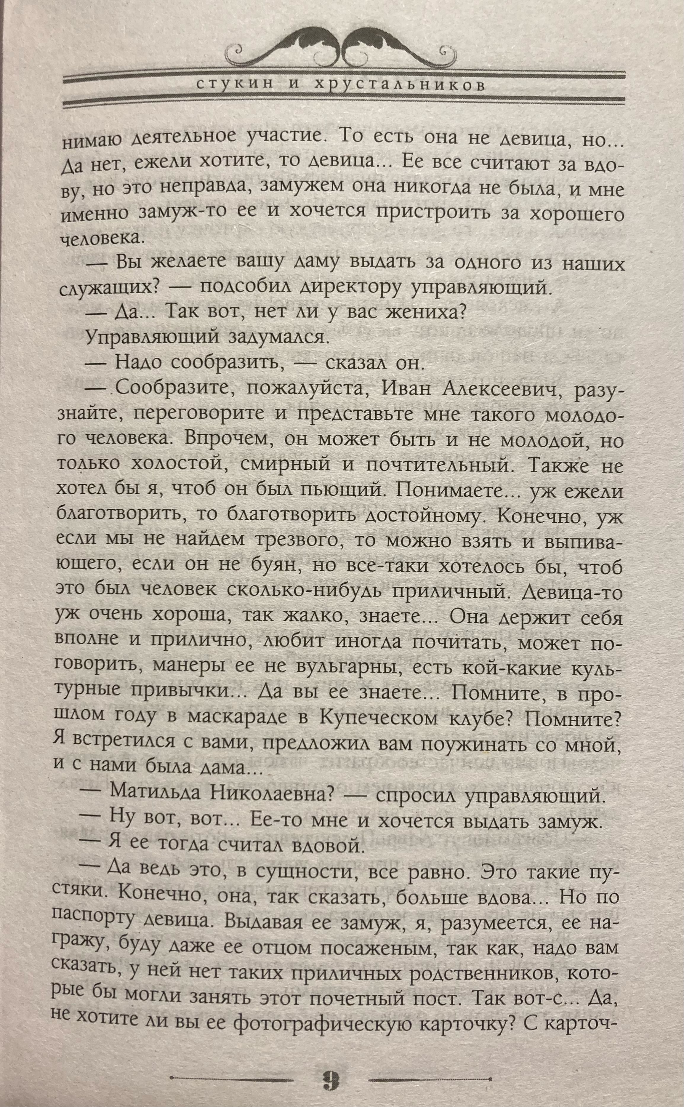 Hrustalņikovs ir bankas "Lētais tirdzniecības kredīts" direktors; Stukins ir mazsvarīgs darbinieks bankas birojā. Hrustalņikovs ir liels krāpnieks, kas rīkojas ar miljoniem dolāru bankas aktīvos; Stukins ir mazs, nožēlojams krāpnieks, nobružāts un pastāvīgi domā par iespēju nozagt dažus rubļus. Direktoram "vajag" apprecēt "savu dāmu" Matildu Nikolajevnu, un viņam tas jādara ātri, lai nodrošinātu viņas topošajam bērnam likumīgu sociālo statusu. Pēc uzņēmuma biroja vadītāja Bezputnova ieteikuma Hrustalņikova izvēle krīt uz Stukinu, pusmūža vīrieti, pazemīgu, atturībnieku un bez ierunām piekrīt visiem viņam izvirzītajiem nosacījumiem — vispiekāpīgāko un pieejamāko pielūdzēju.