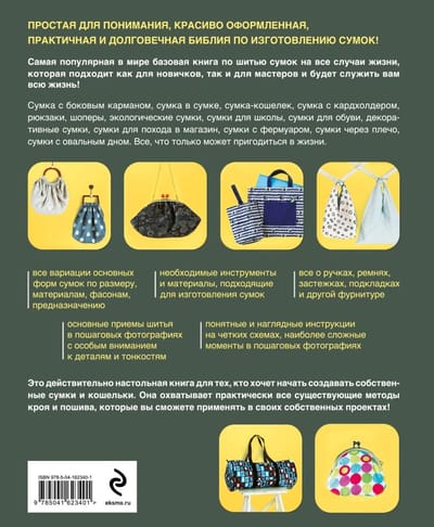 Pirmo reizi krievu valodā - visaptveroša enciklopēdija par rokassomiņām no japāņu meistariem, kas jau ir iekarojusi daudzas valstis! Viegli saprotama, skaisti noformēta, praktiska un izturīga rokassomu izgatavošanas Bībele! Milzīgs gandrīz visu stilu somu piegrieztņu krājums ar izmēru un materiālu variācijām, ar detalizētām instrukcijām par piegriešanas, šūšanas, montāžas un apdares secību. Grāmata, pateicoties kurai jūs varat izveidot sev vai pēc pasūtījuma pilnīgi jebkuru somu - no elegantas sajūga līdz ietilpīgai mugursomai!