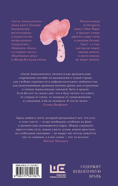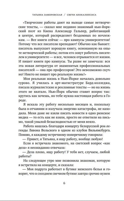 "Apokalipses sveces" ir Tatjanas Zamirovskas, rakstnieces un žurnālistes, romāna "Nāve.net", krājumu "Nejauši izvēlētu skaitļu zeme", "Zvirbuļu upe" un "Dzīve bez trokšņa un sāpēm" autores, jauna grāmata.