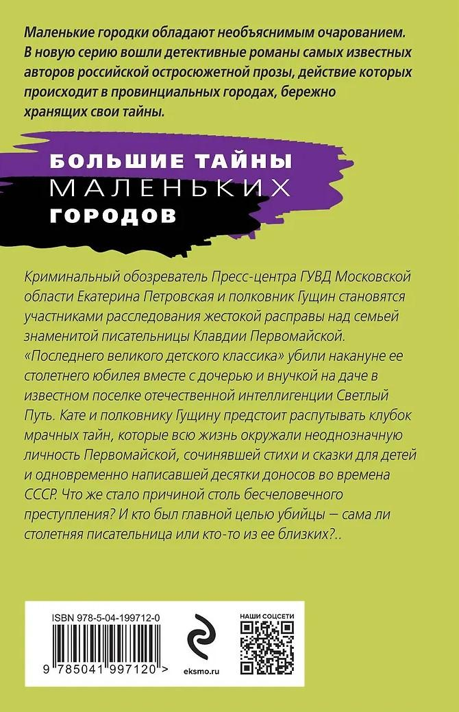 Maskavas apgabala Galvenās Iekšlietu pārvaldes Preses centra kriminālžurnāliste Jekaterina Petrovska kopā ar pulkvedi Guščinu iesaistās slavenās rakstnieces Klavdijas Pervomajskas ģimenes brutālās slepkavības izmeklēšanā. "Pēdējā lielā bērnu klasiķe" tika nogalināta kopā ar meitu un mazmeitu viņas simtgades priekšvakarā viņu dačā "Svetlij Put", ciematā, kas labi pazīstams krievu inteliģences vidū. Katjai un pulkvedim Guščinam ir jāatšķetina tumšais noslēpumu tīkls, kas apvij pretrunīgi vērtēto Pervomajsku, kura padomju laikā rakstīja dzeju un pasakas bērniem, vienlaikus sarīkojot desmitiem nosodījumu. Kas motivēja tik brutālu noziegumu? Un kas bija slepkavas galvenais mērķis — pati simtgadīgā rakstniece vai kāds no viņas tuviniekiem?