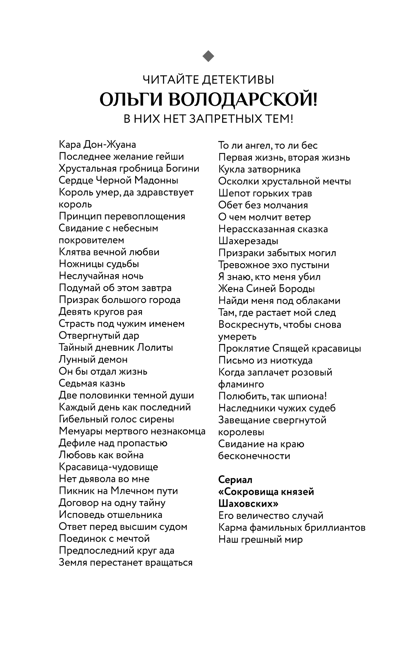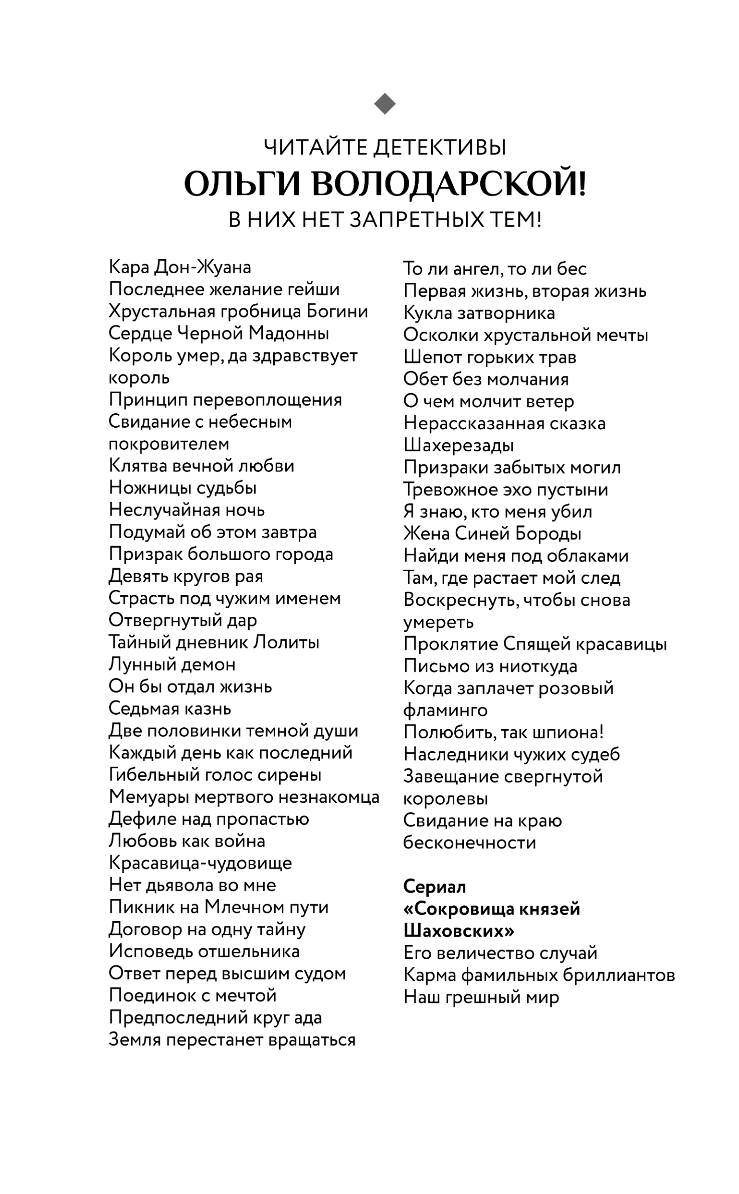 Olga Voldarska ir slavena rakstniece, vairāk nekā piecdesmit grāmatu autore trillera žanrā. Olgas Voldarskajas detektīvstāsti apvieno mūsdienu prozas asumu ar psiholoģiskā trillera spriedzi. Tajos atradīsiet visu, ko vienmēr esat gribējuši zināt, bet baidījāties. Tāpēc grāmatu sērija, kurā tiek publicētas Olgas Voldarskajas grāmatas, saucas "Bez tabu tēmām!".