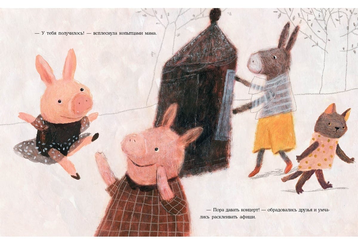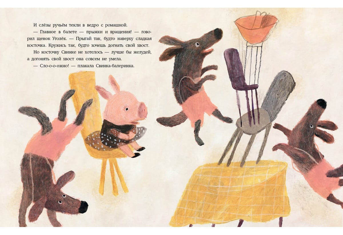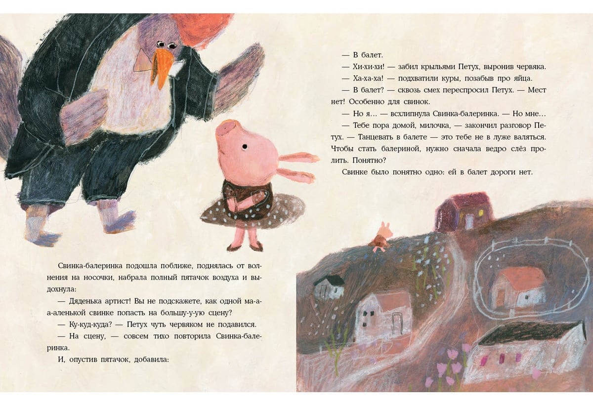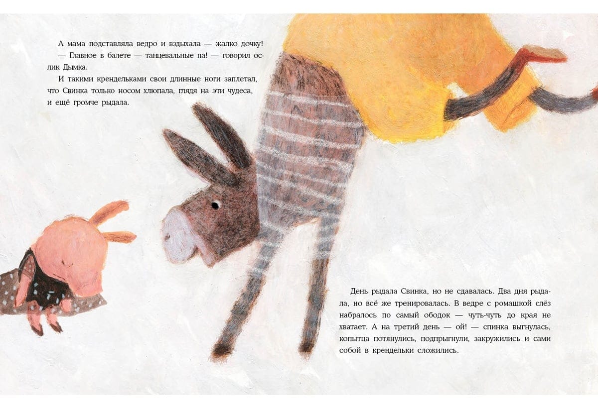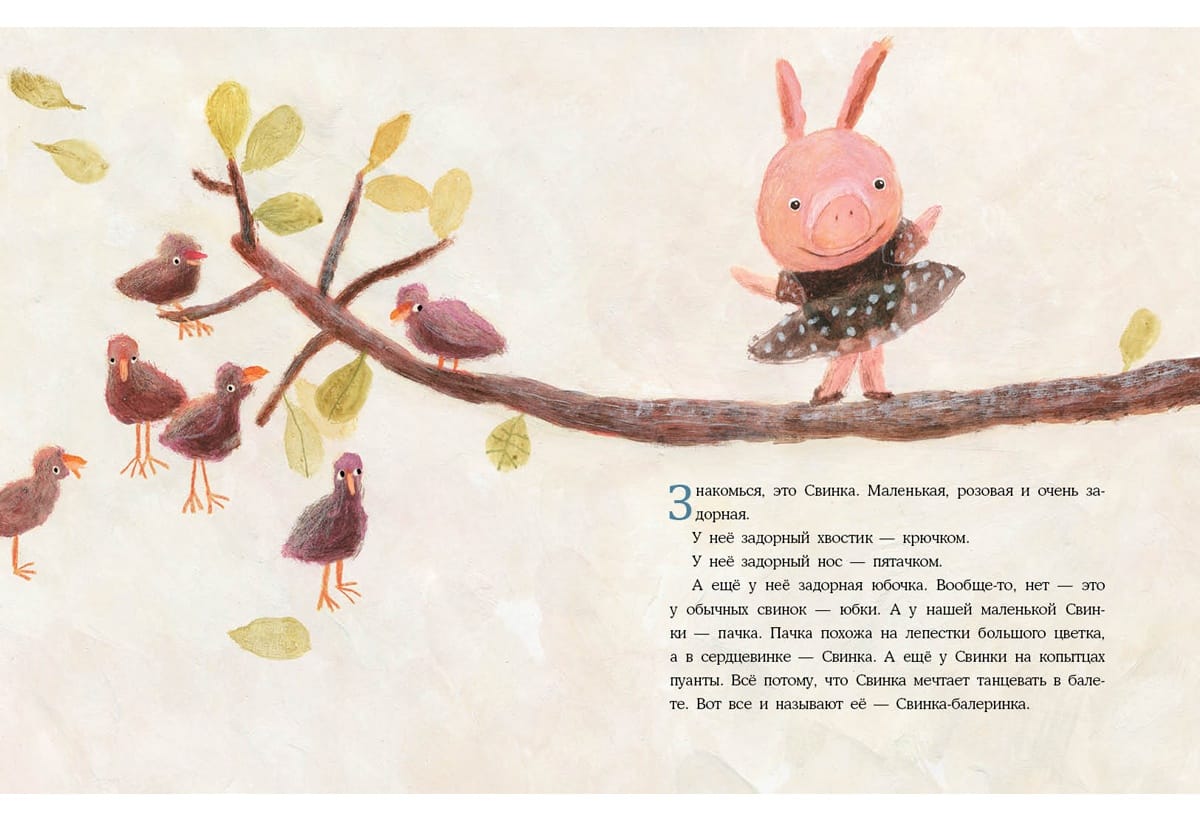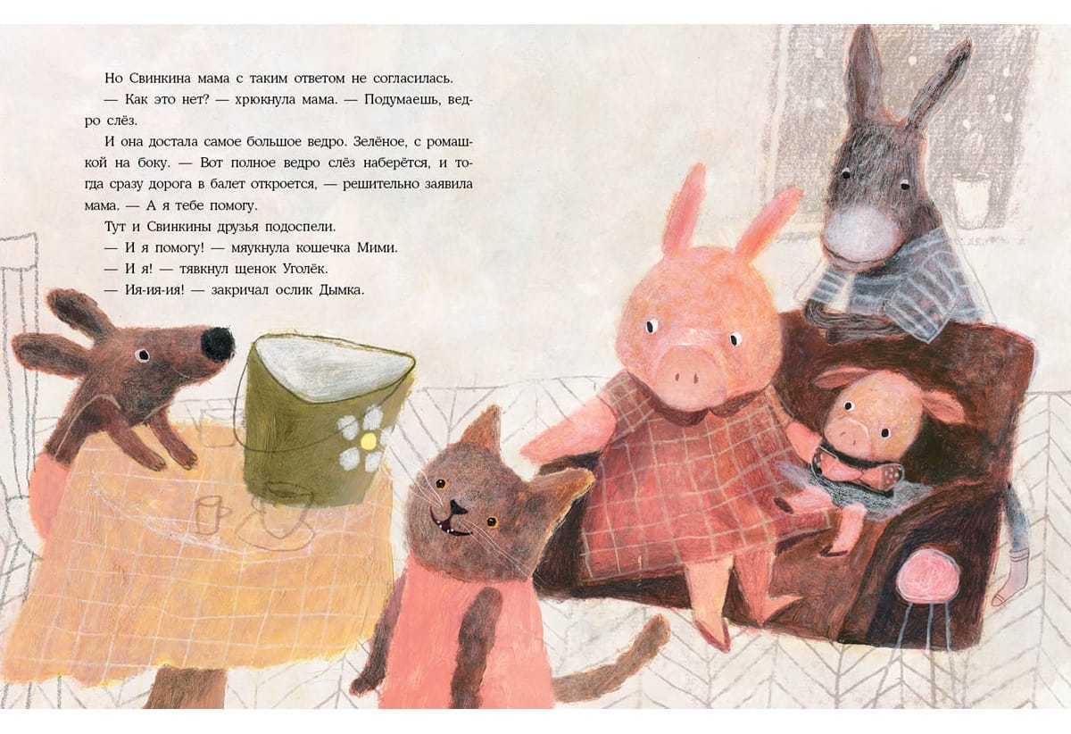 Mūsu stāsta varone ir maza cūciņa. Viņai ir īsts sapnis - dejot baletā! Bet visi fermā saka, ka viņa nevar iekļūt baletā - pat galvenais mākslinieks Gailis? Viņi saka, ka viņai vispirms jāizlej spainis asaru! Par laimi, viņas gādīgā mamma un uzticamie draugi neļaus balerīnai Cūcītei izmist un atteikties no sava sapņa! Ar viņu palīdzību Pigija uzsāk grūto ceļu uz skatuvi? Grāmata ilustrēta ar Natālijas Šalašvili jautriem zīmējumiem.