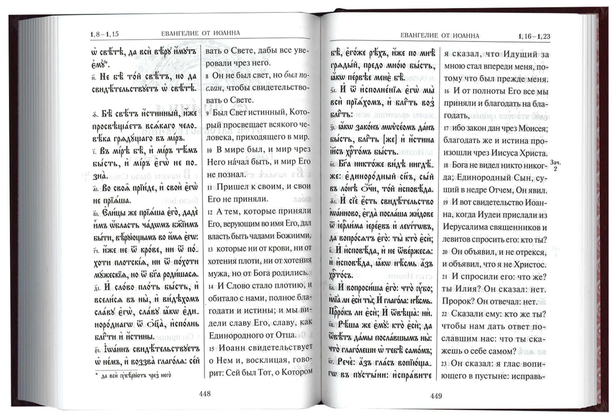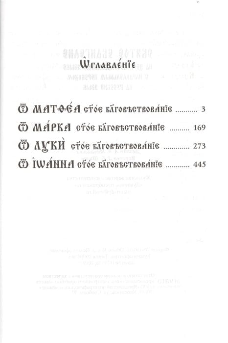 Līdztekus baznīcas slāvu evaņģēlija tekstam ir sinodālais tulkojums krievu valodā. Grāmata būs noderīga tiem, kas vēlas labāk izprast Svētos Rakstus kopumā un īpaši to fragmentu lasīšanu dievkalpojuma laikā, tiem, kas novērtē baznīcas slāvu valodas skaistumu un poēziju, tās tuvību grieķu Septuagintas senajam tekstam.