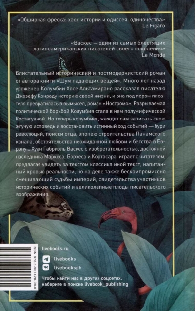 Spilgts vēsturisks un postmoderns romāns no "Krītošo lietu trokšņa" autora. Pirms daudziem gadiem Kolumbijā dzimušais Hosē Altamirjano izstāstīja rakstniekam Džozefam Konradam savas dzīves stāstu, kas zem rakstnieka spalvas pārtapa daiļliteratūrā - romānā "Nostromo". Politiskās cīņas plosītā Kolumbija tajā kļuva par pusmītisku Kostagvuanu. Taču tagad kolumbietis ilgojas pierakstīt savu sūrstošo atzīšanos un atjaunot patieso notikumu gaitu - revolūciju vētras, tēva meklējumus, Panamas kanāla būvniecības epopeju, negaidītas mīlestības apstākļus un bēgšanu uz Eiropu...