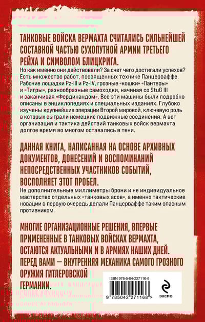 Ir daudz darbu, kas veltīti Panzerwaffe aprīkojumam. Darba zirgi Pz-III un Pz-IV, biedējošie "kaķi" Panthers un Tigers, kā arī dažādi pašgājēji ieroči, sākot no StuG III līdz Ferdinand. Visi šie transportlīdzekļi ir detalizēti aprakstīti enciklopēdijās un specializētos izdevumos. Otrā pasaules kara galvenās operācijas, kurās vācu mobilajām vienībām bija galvenā loma, ir rūpīgi pētītas. Tomēr Vērmahta tanku spēku organizācija un taktika ilgu laiku ir palikusi lielā mērā neskaidra. Šī grāmata, kas balstīta uz arhīva dokumentiem, ziņojumiem un notikumu tiešo dalībnieku memuāriem, aizpilda šo robu.