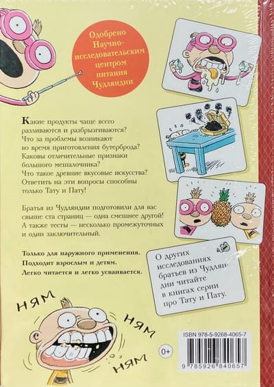 Kādi pārtikas produkti visbiežāk izplūst un izšļakstās? Kādas problēmas rodas, gatavojot sviestmaizi? Kādas ir lielā maisītāja pazīmes? Kādas ir senās garšas mākslas? Uz šiem jautājumiem var atbildēt tikai Tatu un Patu! Brāļi no Čudlendas tev ir sagatavojuši vairāk nekā simts lappušu - viena par otru smieklīgākas! Kā arī testus - vairākus starpposma un vienu noslēguma. Tikai ārējai lietošanai. Piemērots pieaugušajiem un bērniem. Viegli lasāms un viegli uztverams.