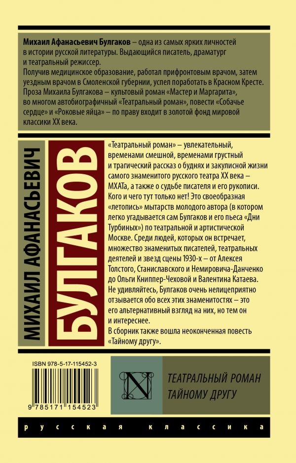 "Teātra romāns" - aizraujošs, brīžiem smieklīgs, brīžiem skumjš un traģisks stāsts par 20. gadsimta slavenākā Krievijas teātra - Maskavas Mākslas teātra - ikdienu un aizkulišu dzīvi, kā arī par rakstnieka un viņa rokraksta likteni. Kas un kas ir ne tikai šeit! Tā ir savdabīga jaunā autora "ceļojumu hronika" (kurā viegli var nojaust pašu Bulgakovu un viņa lugu "Turbīnu dienas") pa teātri un māksliniecisko Maskavu. Starp cilvēkiem, kurus viņš satiek, ir daudzi slaveni rakstnieki, teātra personības un 20. gadsimta 30. gadu skatuves zvaigznes - no Alekseja Tolstoja, Staņislavska un Ņemiroviča-Dančenko līdz Olgai Knipper-Čehovai un Valentīnam Katajevam. Nebrīnieties, Bulgakovs par visām šīm slavenībām izsakās ļoti nelaipni - tas ir viņa alternatīvais skatījums uz tām, bet par to interesantāks. Krājumā iekļauts arī nepabeigtais stāsts "Slepenam draugam".