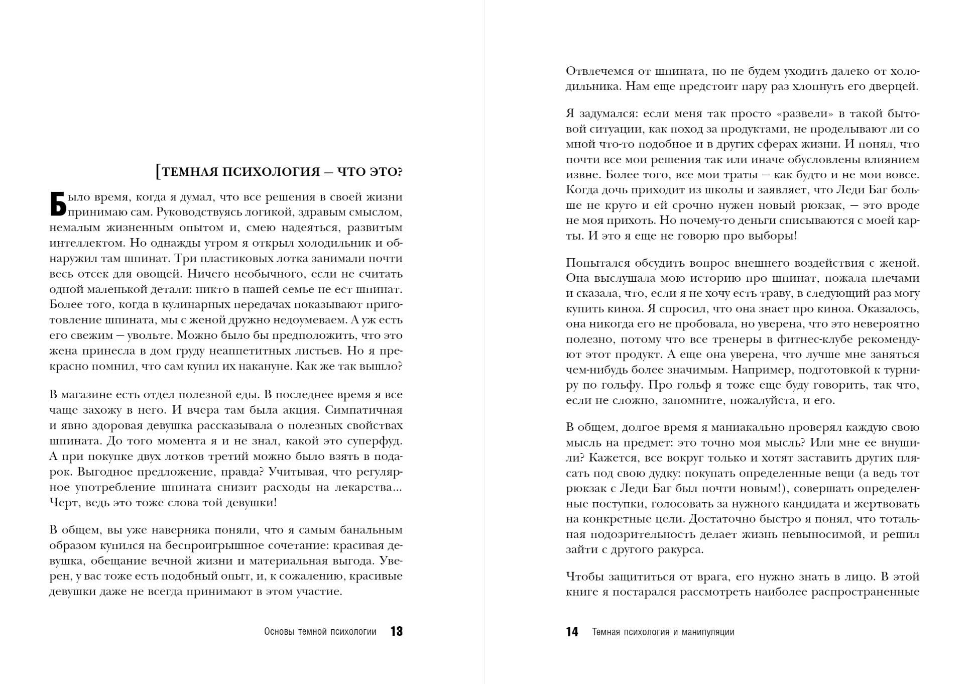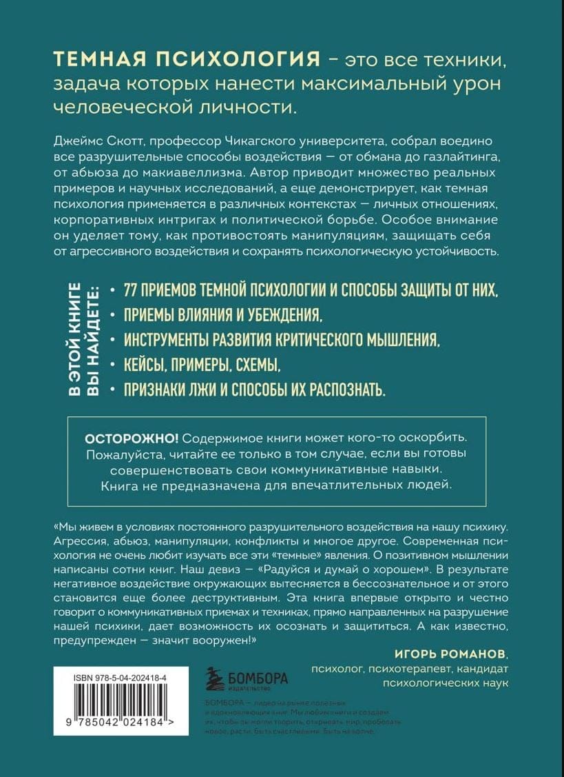 Džeimss Skots, Čikāgas universitātes profesors, apkopoja visus postošos ietekmes veidus, sākot ar maldināšanu un beidzot ar gazlekciju un beidzot ar mačiavelliānismu. Autors min daudzus reālās dzīves piemērus un zinātniskos pētījumus, kā arī demonstrē, kā tumšā psiholoģija tiek pielietota dažādos kontekstos – personiskajās attiecībās, korporatīvajās intrigās un politiskajā cīņā. Viņš pievērš īpašu uzmanību tam, kā pretoties manipulācijām, pasargāt sevi no agresīvas ietekmes un uzturēt psiholoģisko stabilitāti.