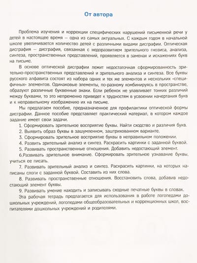 Rokasgrāmata ir veidota tā, lai novērstu tādu rakstības pārkāpumu bērniem kā optiskā disgrāfija. Izdevumā iekļauts praktisks materiāls krievu valodas burtu rakstības apguvei un to pareizs attēls rakstībā. Darbagrāmatu var izmantot pirmsskolas izglītības iestāžu terapeiti, vispārizglītojošo skolu skolotāji, pirmsskolas izglītības iestāžu pedagogi un pirmsskolas izglītības iestāžu vecāki.